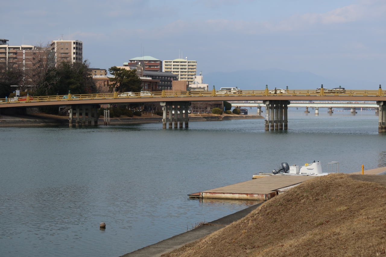 琵琶湖の南部を流れる瀬田川。その瀬田川に架けられた国道1号線と東名高速の間に架かる橋が瀬田の唐橋です。日本三名橋の一つに数えられる橋で、近江八景の「瀬田夕照」にも登場する橋です。現在の橋は昭和になって架け替えられた橋ですが、緩やかなそりがあり、卵管には擬宝珠が設置され昔の橋のように再現されています。