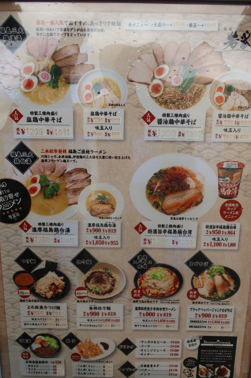 二本松駅から500m程、旧国道4号線沿いにある人気のラーメン店が麺処若武者 本店です。某サイトでの評価が高く訪れて見ると、行列は出来ていませんでしたが、次から次へと人が来る人気店。頂いたのは特製三種肉盛り塩鶏中華そば。味わいのあるスッキリしたスープがとても美味しくスープをすべて飲んで頂くほど。三種肉はそれぞれ個性があり、胸肉が一番美味しいと思いました。こんなラーメン店が自宅近くにあれば良いのにと思える店でした。