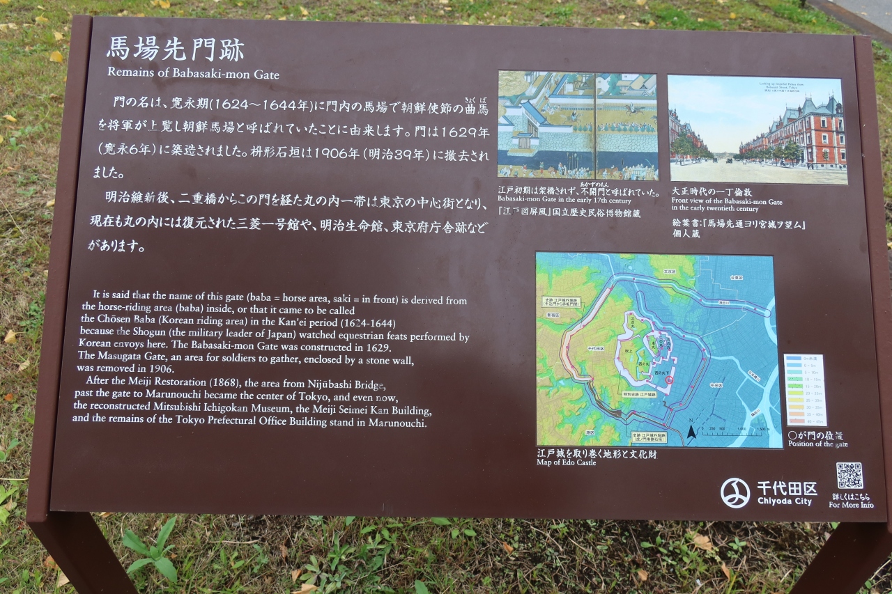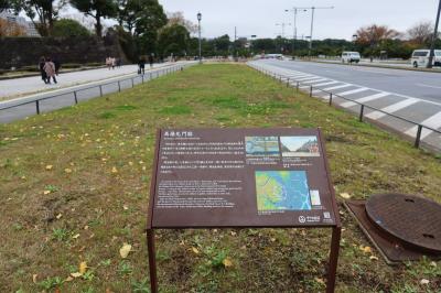 明治生命館の近くにある馬場先門交差点、日比谷駅のB6出口を出た所に馬場先門跡の案内板があります。内濠に架けられた土橋の先に馬場があり、朝鮮特使団が馬術の披露したことから馬場先の名が付けられたそうです。