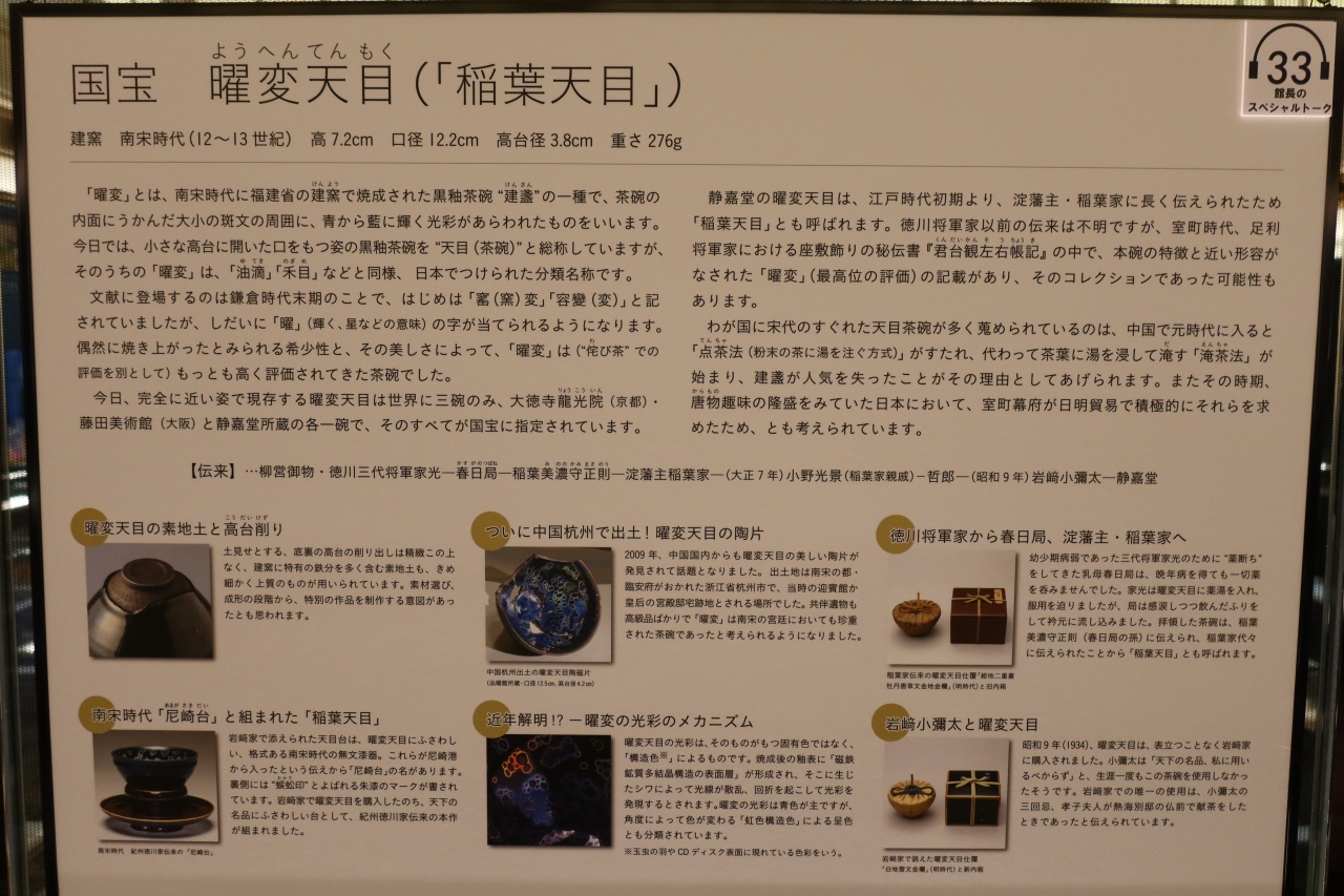 開館記念として「響きあう名宝」展が開催されており、これを観に行って参りました。中央のホールを囲む様に展示ギャラリーがあり、その中で曜変天目を始めとする国宝3点他由緒のある名品を観ることができました。