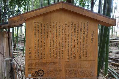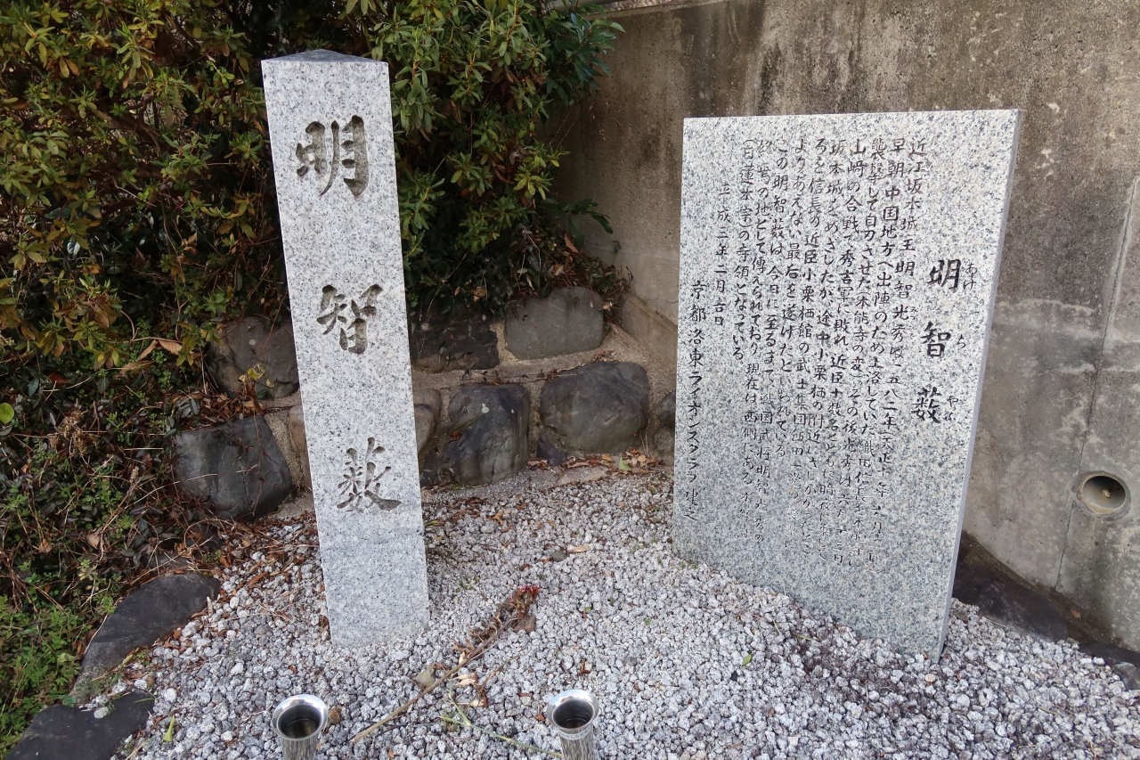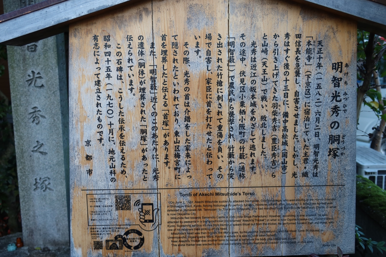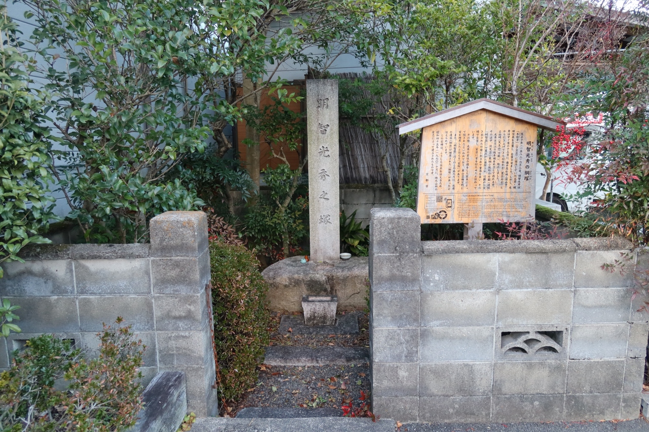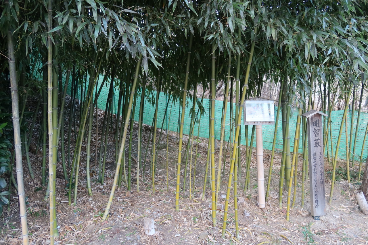 醍醐駅から南西に800m程行った入り組んだ山側の住宅街の奥に明智藪があります。豊臣秀吉に敗れ、敗走した明智光秀が落ち武者狩りで打ち取られたとされる場所です。本当にこの場所であったのか分かりませんが、現在も竹藪があり、案内板や石碑が近くに建てられています。ただ、打ち取られた場所と言うだけで見応えないです。