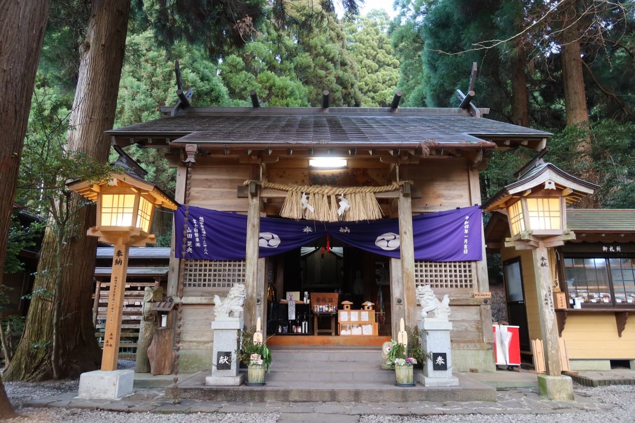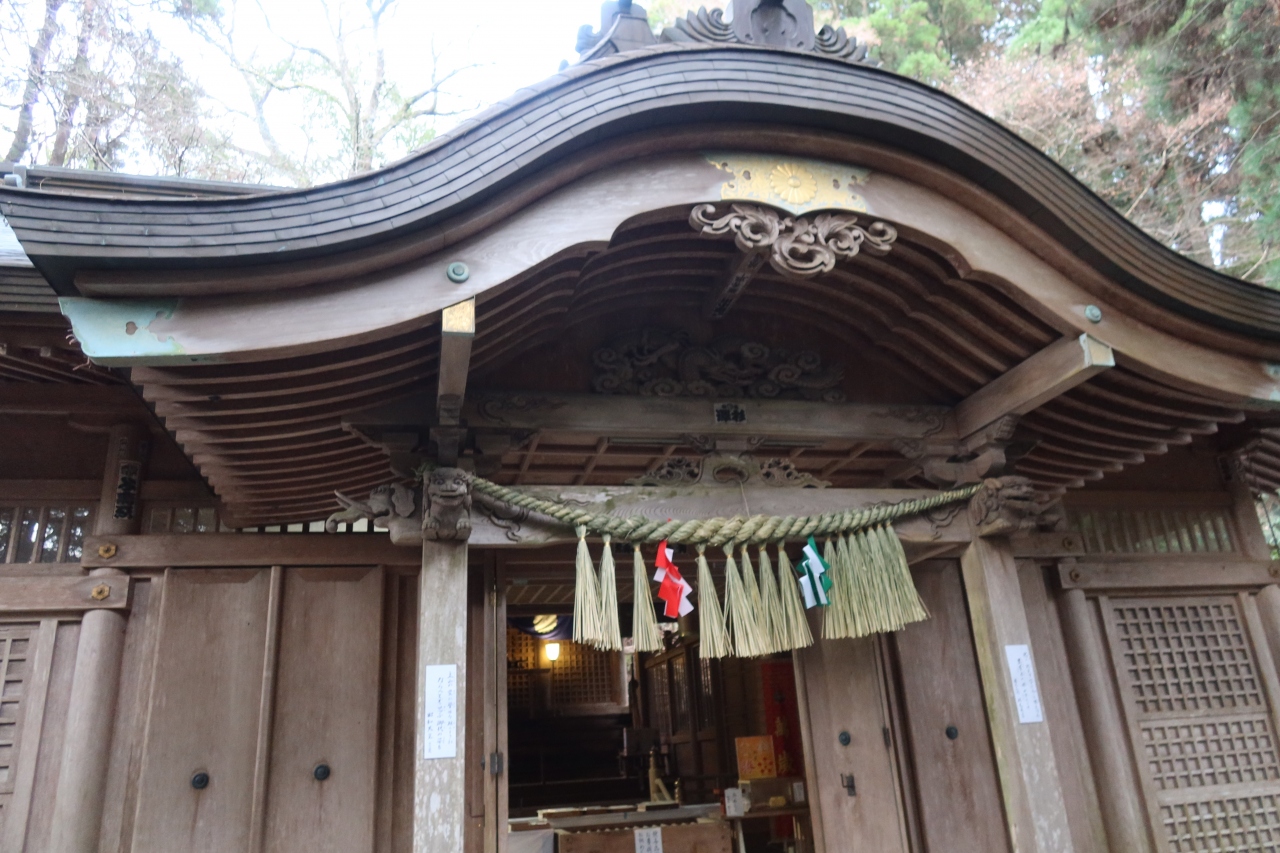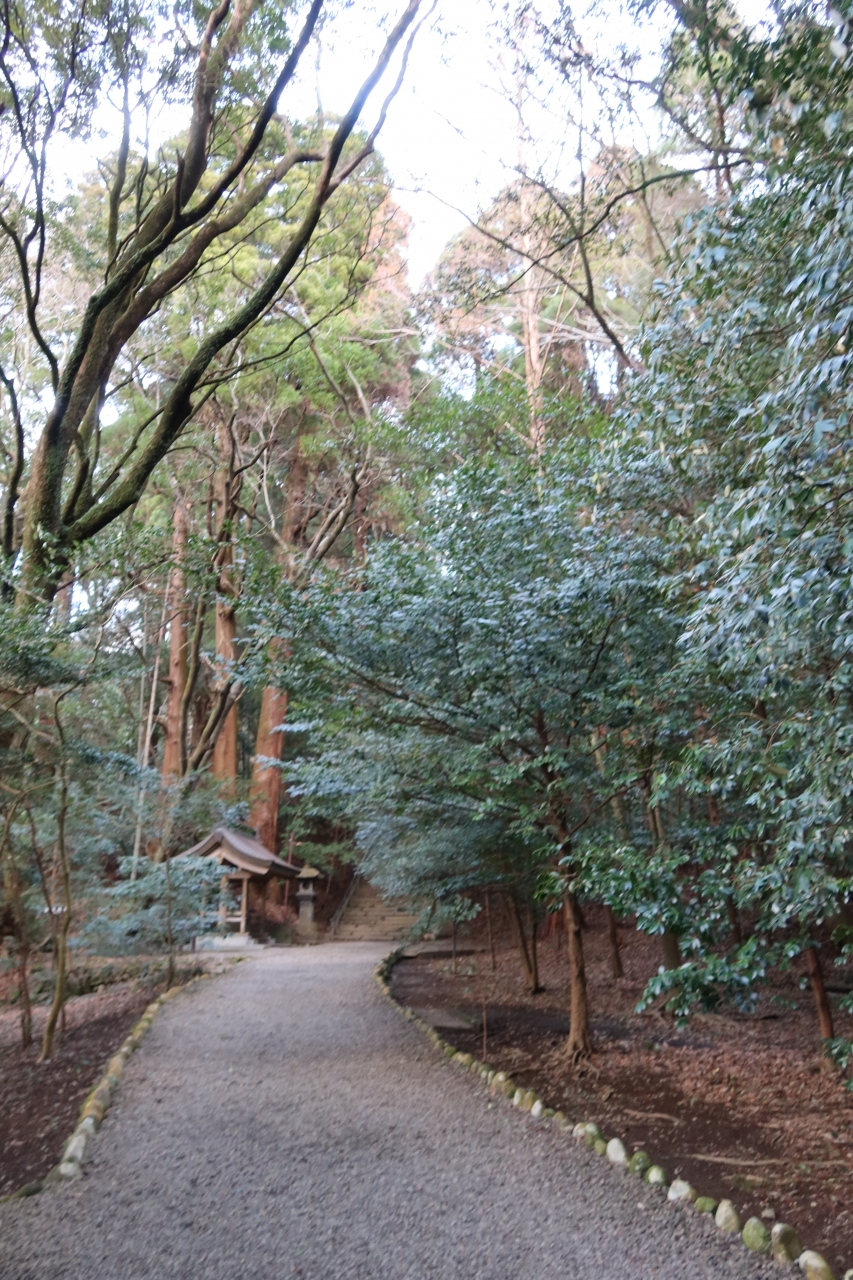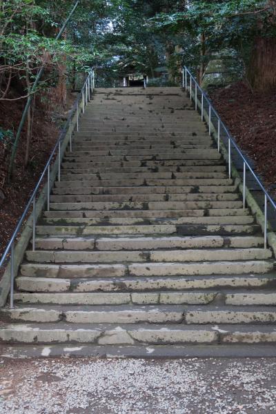 鳥居から森の中の参道を進むと高い石段があり、その奥に社殿があります(石段は急でおじさんにはキツイです。石段下りた後、神社の人と話したら鳥居の右手に車道があり、それを使えば社殿の横まで行けたとのこと。)。天孫降臨の地と言われる高千穂の槵觸の峰に鎮座する神社で、鬱蒼とした森に囲まれた神社です。