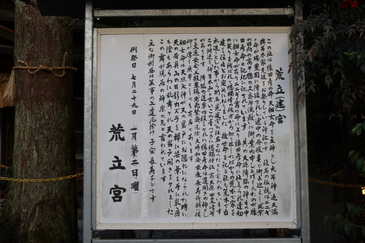高千穂の天真井の近くに荒立神社があります。猿田彦命と天鈿女命を祀る神社です。猿田彦命と天鈿女命が結婚され、その住まいを荒木を使い急いで建てたことが名の由来です。芸事、縁結びにご利益があり、女性に人気があるパワースポットでした