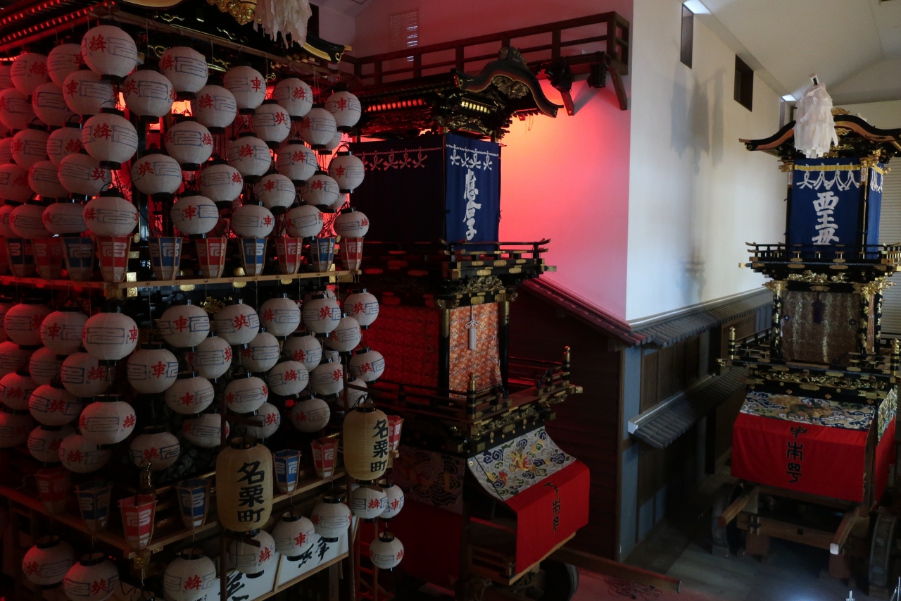 犬山の本町通りにある犬山祭で使用される山車を展示する施設がどんでん感です。館内には全面に提灯が吊り下げられた山車、錦の布で飾れらた山車など豪華絢爛な本物の山車を見ることができます。また、展示室では犬山祭りの資料やビデオが展示されています。犬山祭は見たことがありませんが、高山祭に似てているんだなぁと思いました。