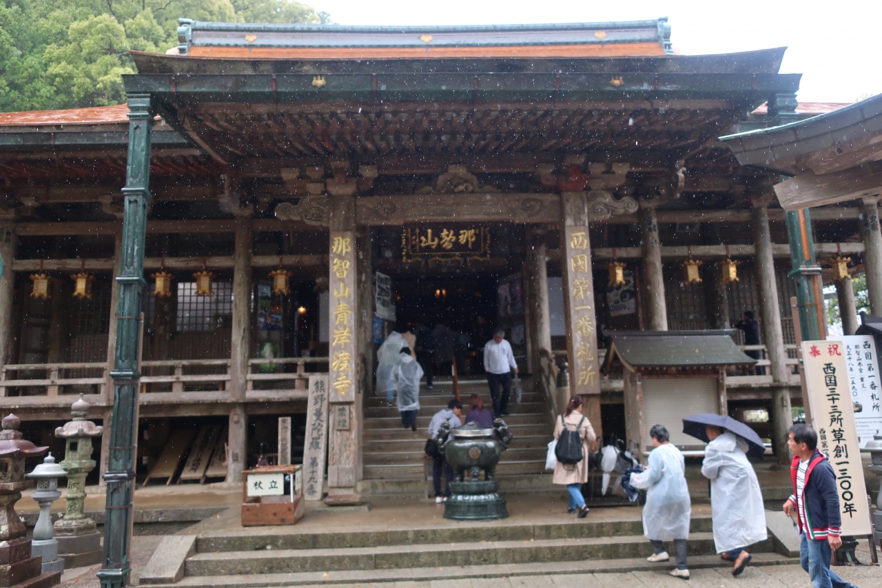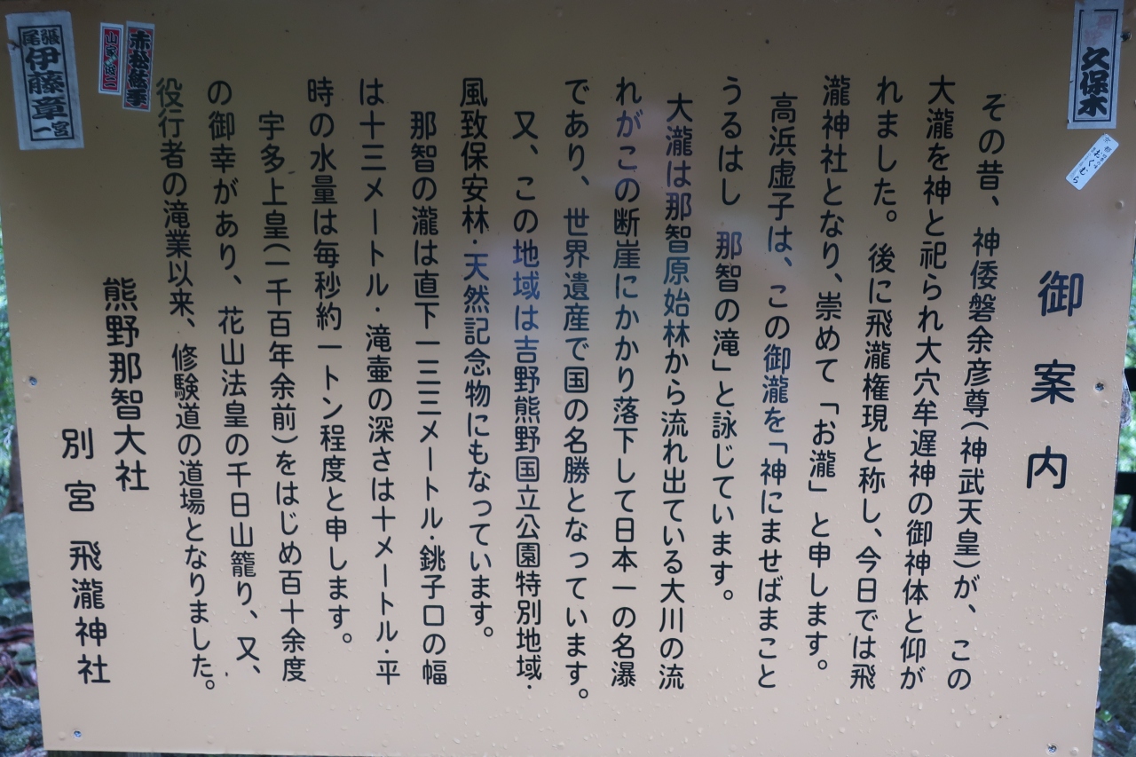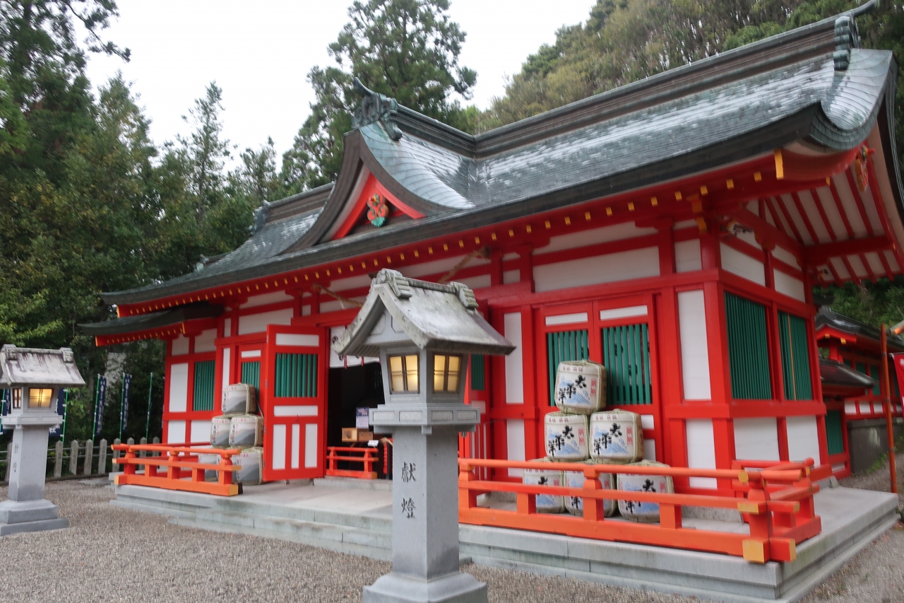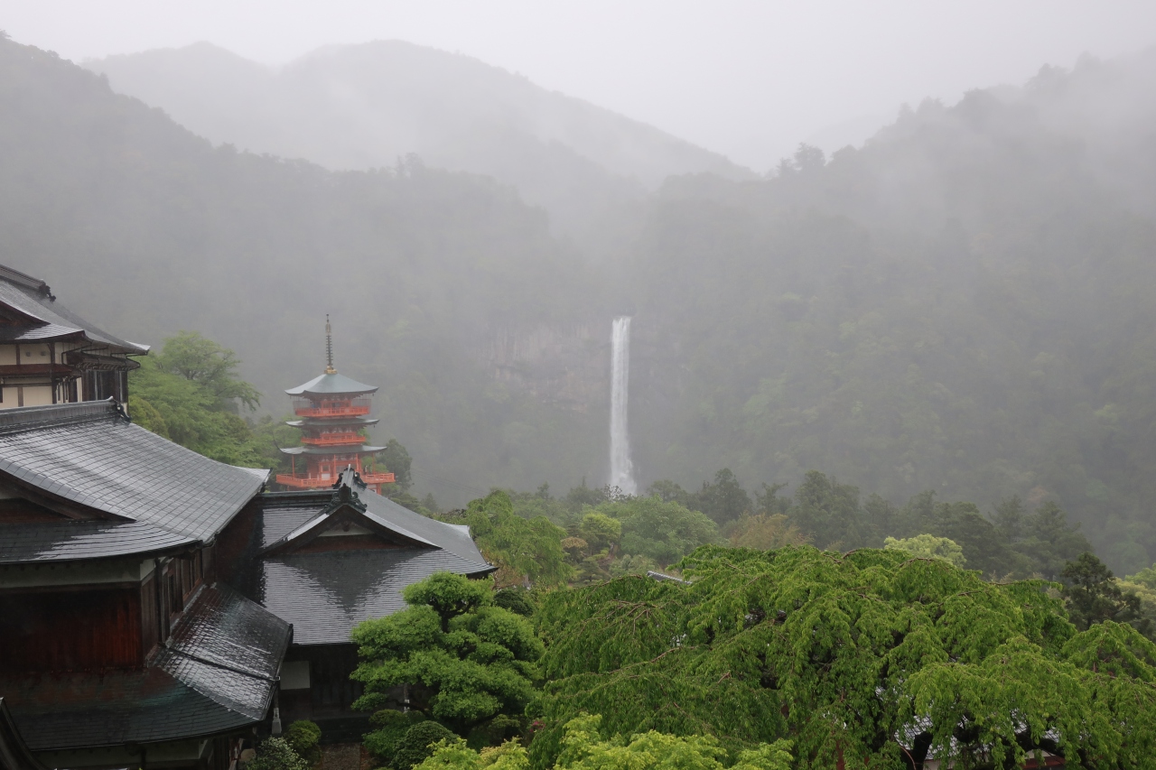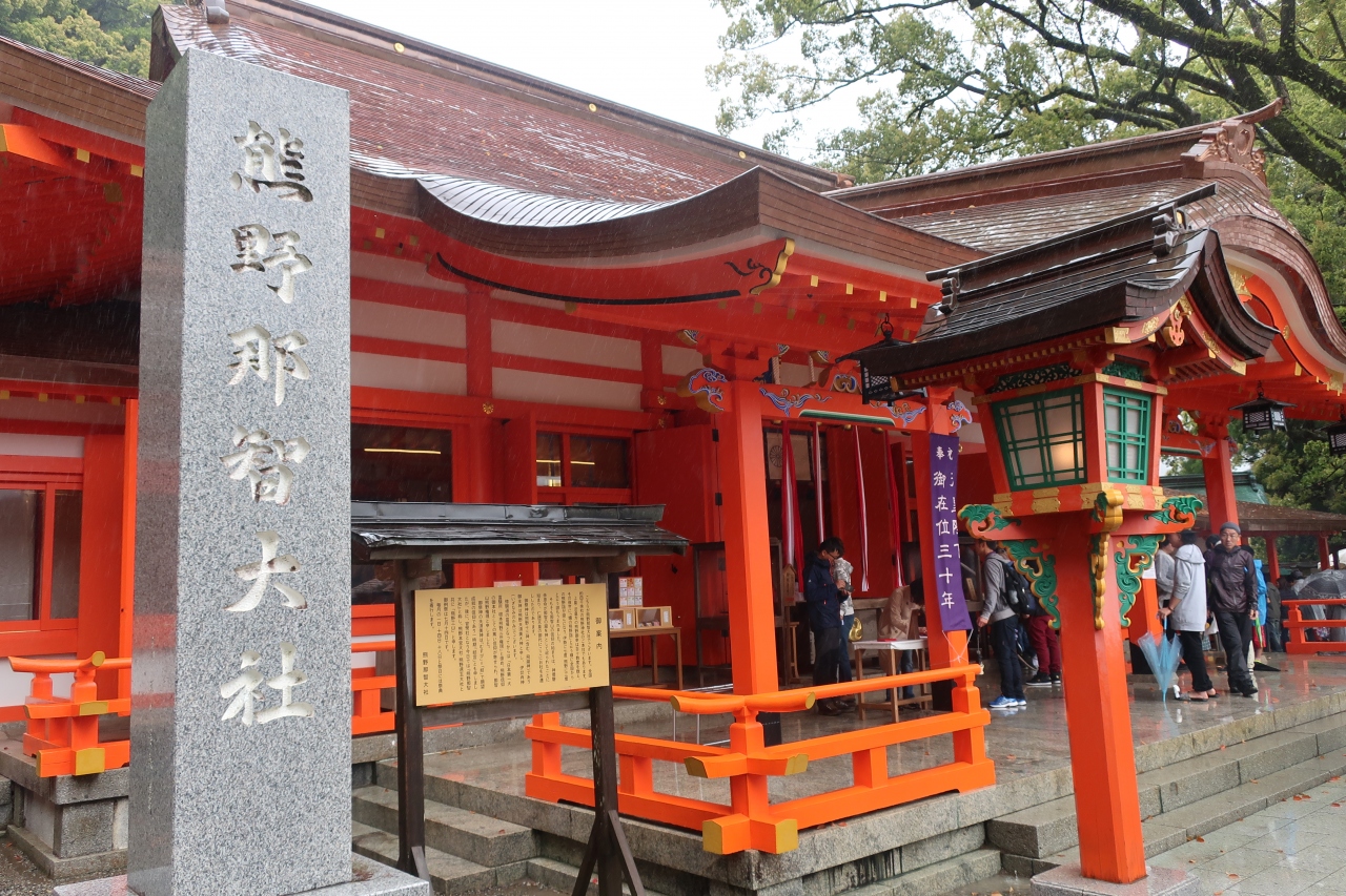 約6年ぶりに熊野那智大社にお参りしてきました。今回も駐車場から土産物店の並ぶ参道の石段を10分程上って、大鳥居を潜ると那智大社の境内に辿り着きます。境内からは那智山全体が見渡せますが生憎の雨でもやっていました。熊野夫須美大神を祀る本殿、および奥殿は朱色が艶やか。拝殿の左手にはサッカー協会のエンブレムにもなっている八咫烏を祀る御縣彦社があり、サッカーファンには是非ともお参りしたい社です。
