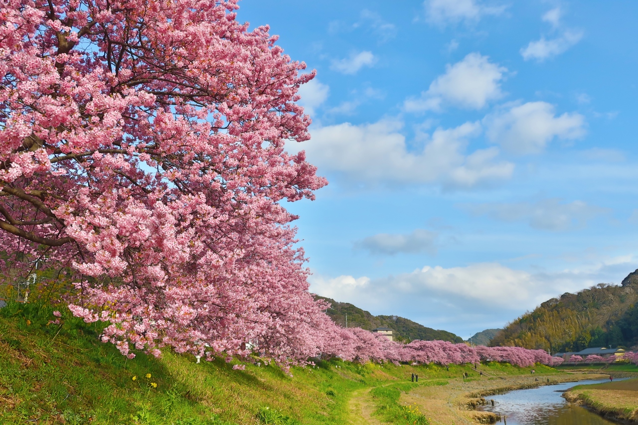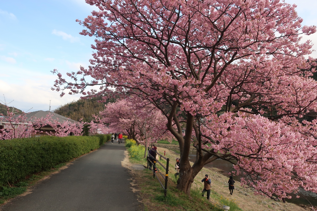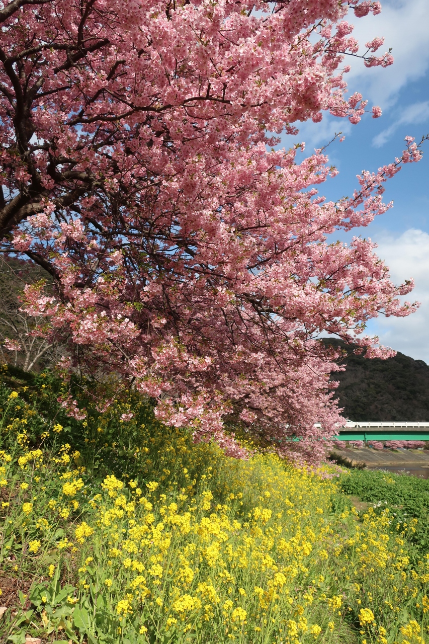 南伊豆 下賀茂温泉を流れる青野川沿いに植えられた早咲きの河津桜と菜の花のコラボが美しい早春を彩る春祭りです。本家本元の河津の河津桜は護岸された堤に桜が植えられているのに対しこちらは普通の堤に桜が植えられ、そして堤には菜の花。その自然な感じがとても良いです。そしてアクセスが悪いからでしょうが河津よりも人込みも少なくゆっくりと桜を眺められます。そのためフォトジェニックな河津桜が見られるのが魅力です。