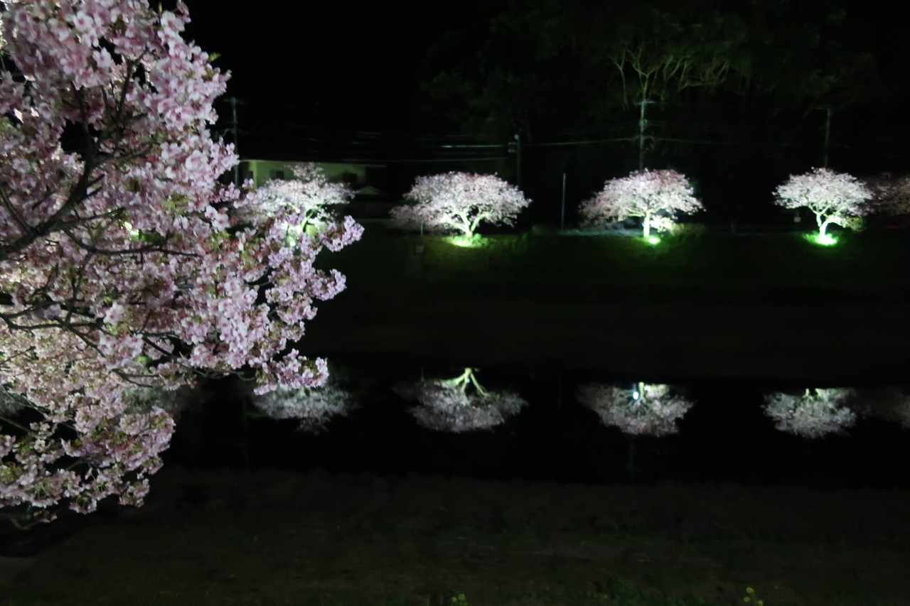 下賀茂温泉を流れる青野川沿いに植えられた河津桜の並木がみなみの桜(青野川千本桜)です。桜の咲く時期にはみなみの桜と菜の花まつりが開催され沢山の人が訪れます。お薦めは夜のライトアップ。ライトアップされたピンクの花が、青野川の水面に映り幻想的な姿を見せてくれます。日帰りでは難しいですが温泉に宿泊したら夜のライトアップは見逃せません。