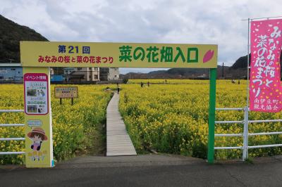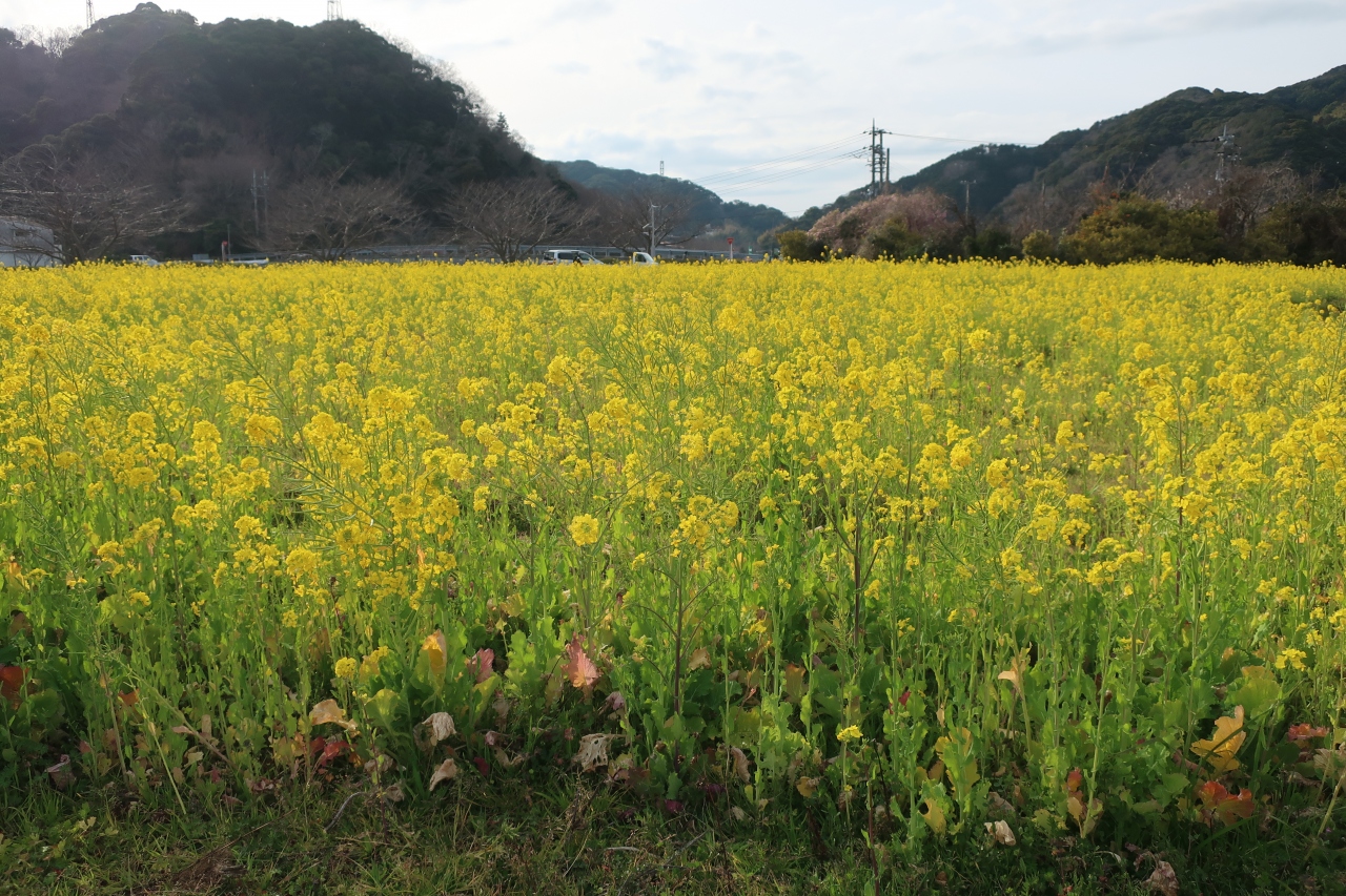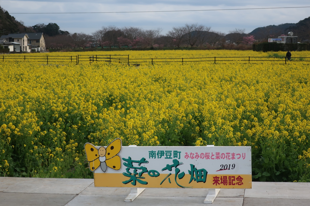 伊豆最南部を走る国道136号線の日野交差点を曲がった所に元気な百姓の花畑公園があります。休耕田を使った花畑公園でみなみの桜と菜の花まつりの時期には一面黄色の菜の花が広がります。菜の花畑の中には木道が通され、菜の花の匂いが早春を感じさせる公園です。