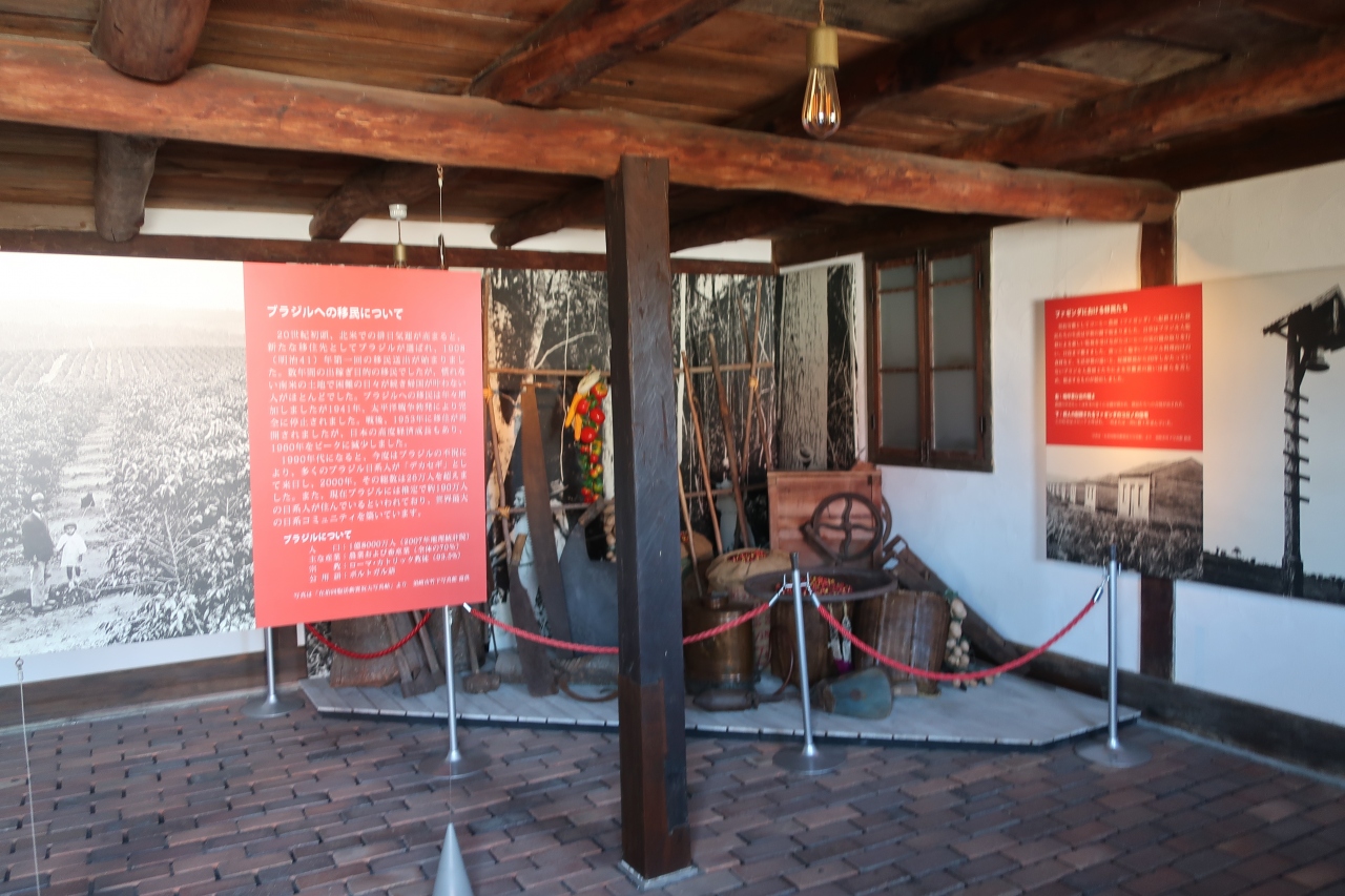 明治村4丁目には日本からの海外に移住した人が海外の地で建てた建物が3つ移築されています。その一つがブラジル移民住宅です。アメリカへの移民が制約を受けた後、ブラジルへの移民が開始された。この住宅は長野から移民した久保田安雄の住宅で大正8年に建てられたもの。スパニッシュ様式の建物で海外の瓦が使われていますが、日本の工法も用いられています。内部ではブラジルに渡った移民の資料が展示されています。