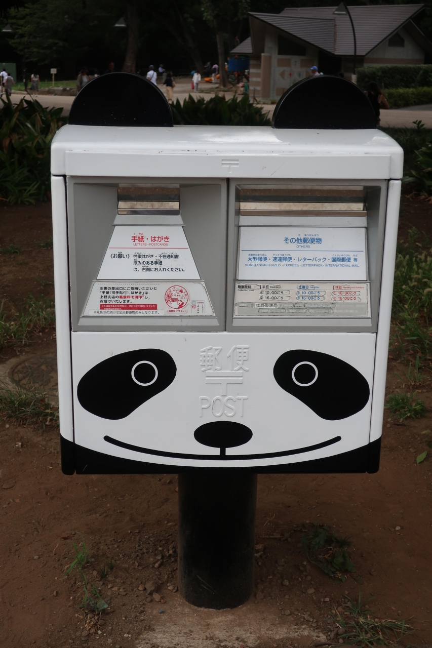 上野恩賜公園のほぼ中央、スターバックスの南側にある郵便ポストです。ちょうど上野動物園の入口に向かう通りの途中にあり、垂れた目をしたパンダの顔が描かれており、とっても可愛いです。話題性はありますが、このポストに投函するとパンダの消印が押されるということはありません。