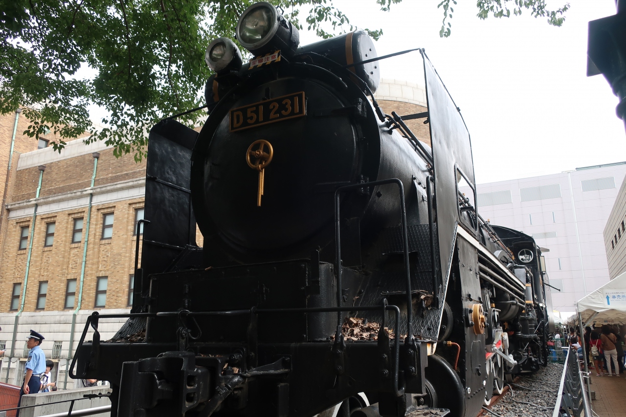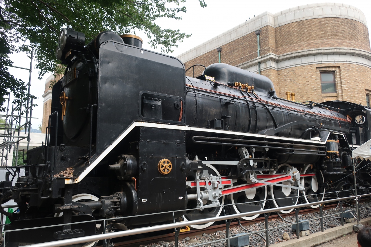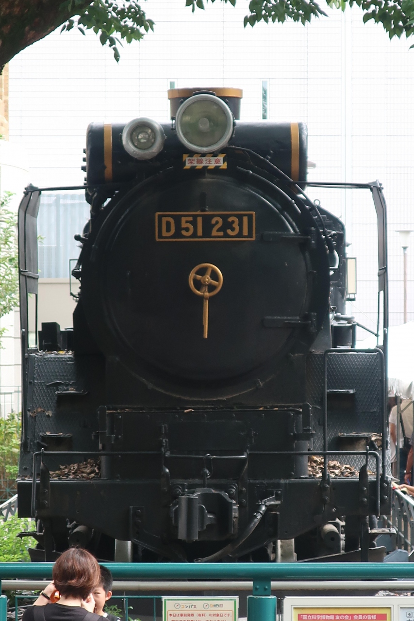 国立科学博物館の入状口に展示されている蒸気機関車です。日本で総数1115両と一番多く作られたD51型の213番の機関車です。近くで、更に無料で見ることが出来ます。