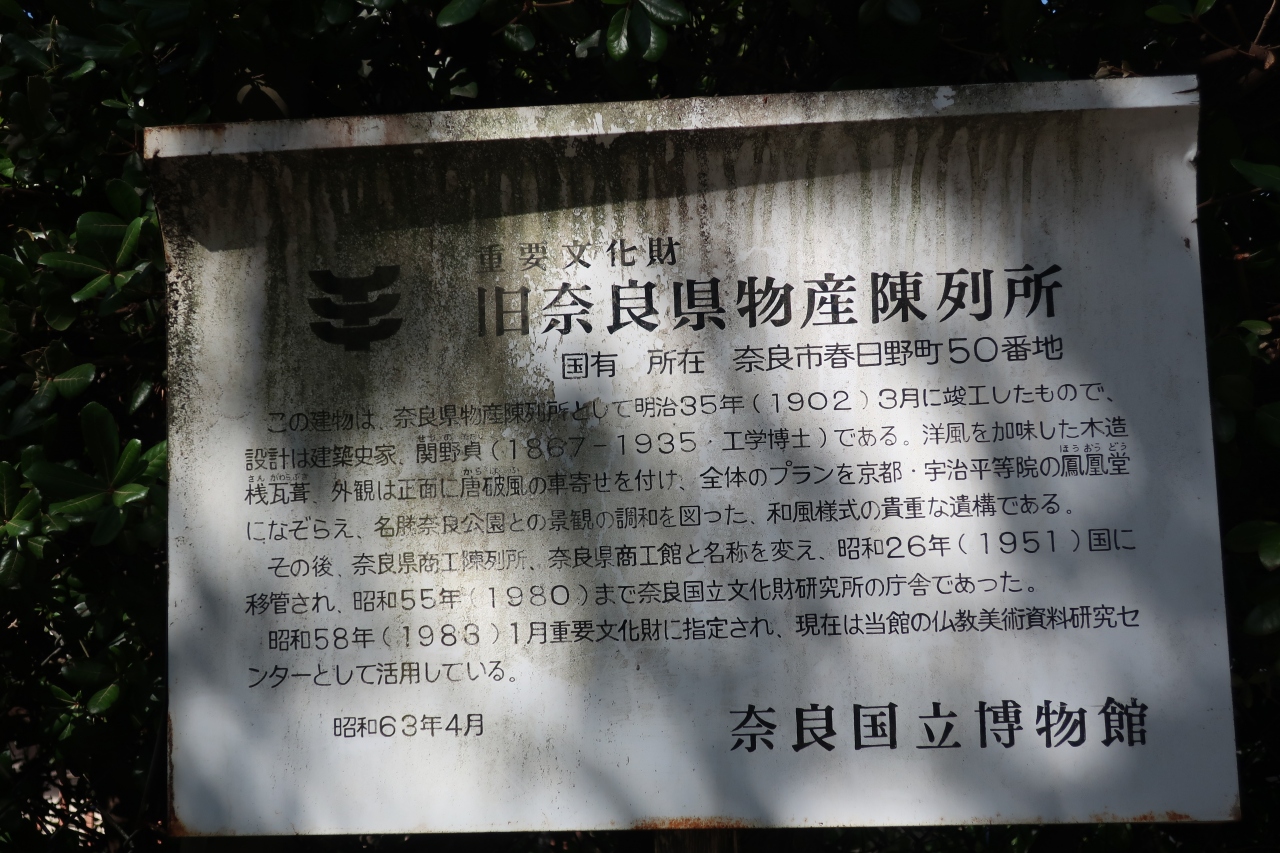 奈良国立博物館の敷地内に仏教美術資料研究センターはあります。関野貞の設計による近代和風建築で奈良県物産陳列所として明治35年に建てられました。和風建築ですが、西洋風の所や、装飾にはイスラム風のデザインもあり、和洋折衷のデザインが当時のモダンを感じる建築物です。奈良は京都の様に明治期の近代建築が多くは無く貴重な存在です。