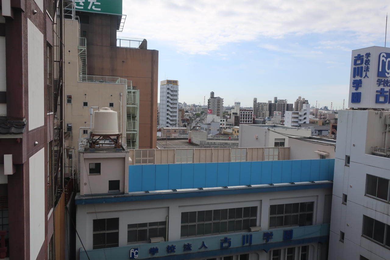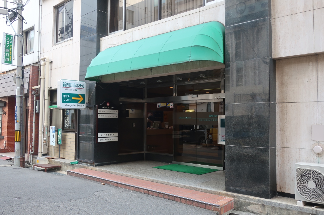 新四日市駅から徒歩1分、中央通りに面したビジネスホテルです。ホテルの入口は中央通り側には無く、横道に入った所にある為分かりづらいです。目印は屋上のグリーンズの看板と1階にあるCAFE De CRIE。