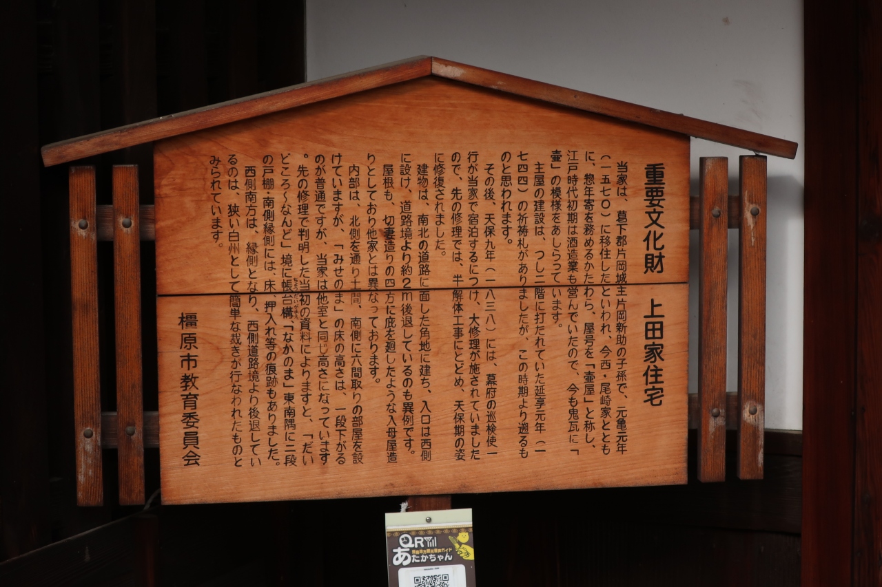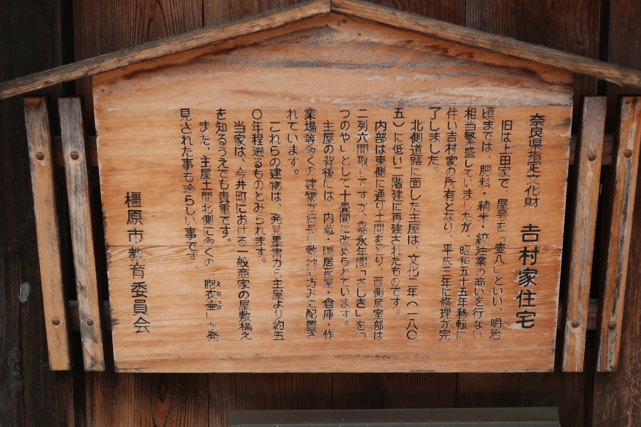 古い町並みが残る奈良今井町の北部、北尊坊通り沿いに屋号を「壷八」と称した旧上田家住宅があります。近くに上田家住宅もあり、同じく屋号に「壺」が付くので分家かもしれません。建物は瓦葺の切妻造りで内部は非公開となっているため外観だけの見学となります。