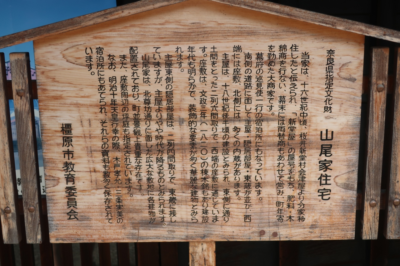 古い町並みが残る奈良今井町の北東部、北尊坊通り沿いにある屋号を「新堂屋」と称する商家の町家です。今井町の他の町家より見た目が古く、二階の剥げかけた漆喰、虫籠窓、屋根の上には煙出しがあり、一味違った感じがします。山尾家住宅は明治天皇の今井行幸の際に木戸孝允、三条実美も宿泊したそうです。