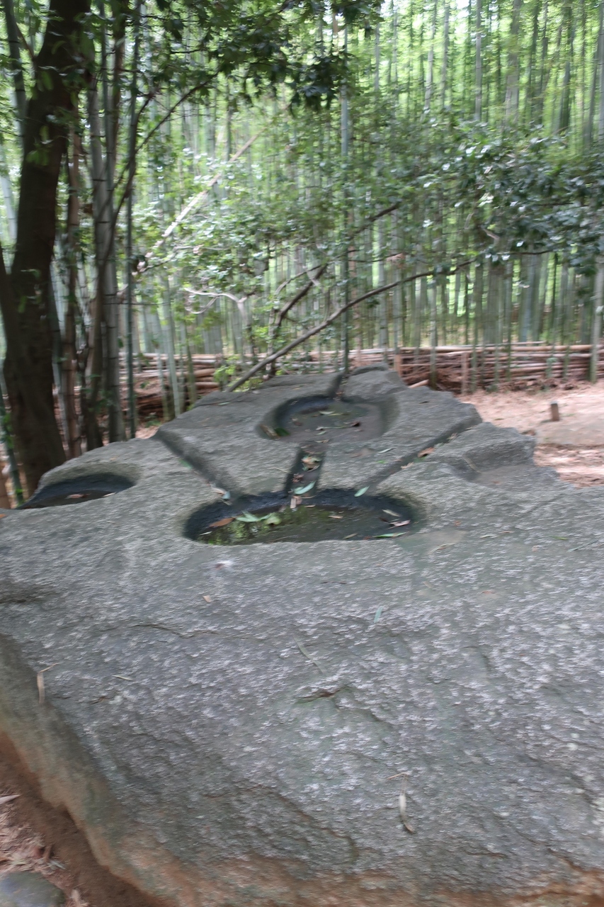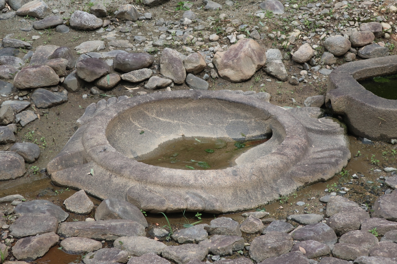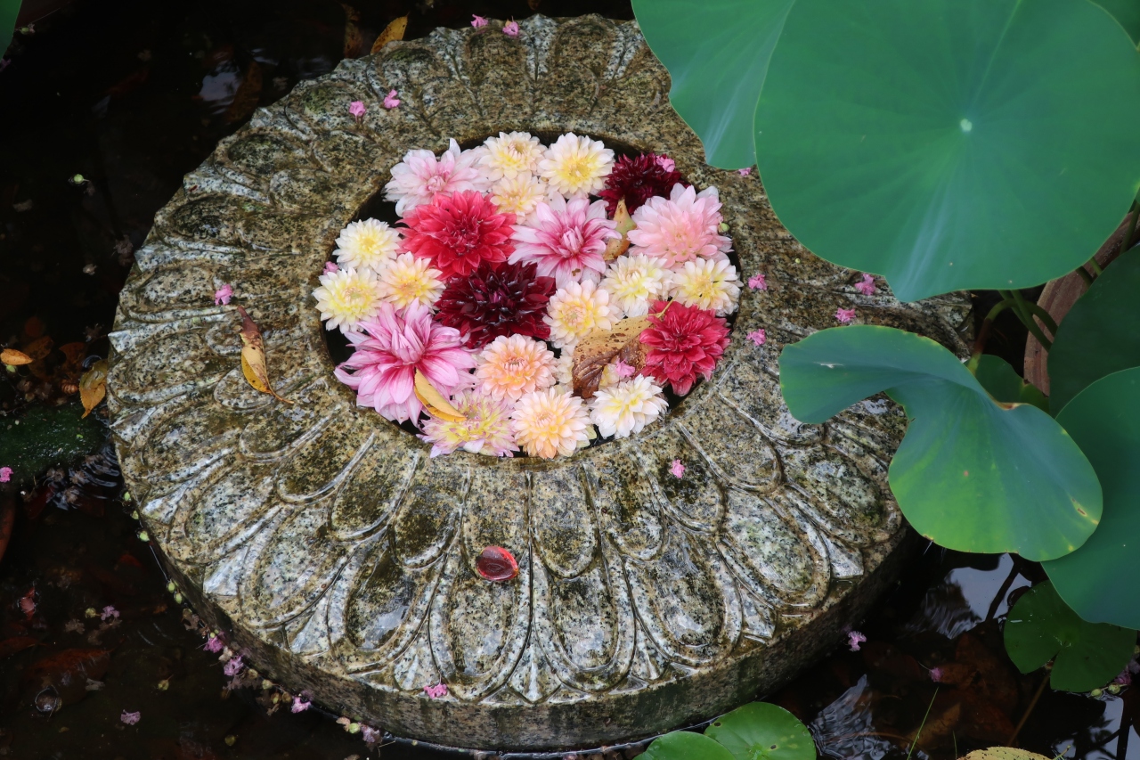 境内を見学していると手水舍、本堂前の鉢にダリアの花が浮かび、とってもインスタ映えします。極楽を表現しているのでしょうか。- 旅行時期