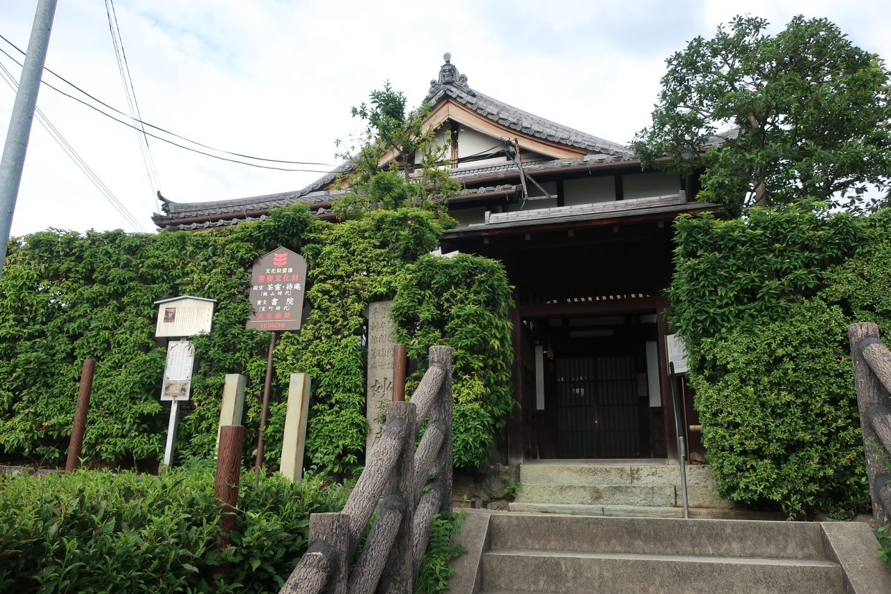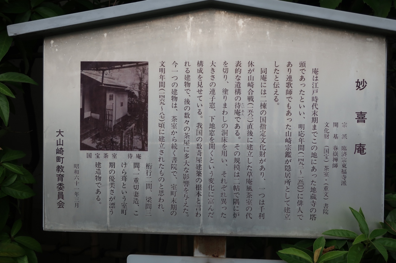 JR山崎駅前を出た左手、ロータリーの東側に妙喜庵はあります。妙喜庵は茶人の千利休が作ったとされる茶室「待庵」が唯一現存していることで有名です。通常は非公開となっており中を見学することはできないので、入口の門からちらりと中を覗くことしかできません。外観だけをみると立札が立っていなければただの古い平屋の住宅と言った風体です。