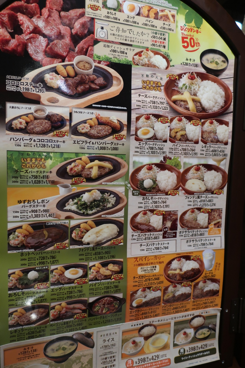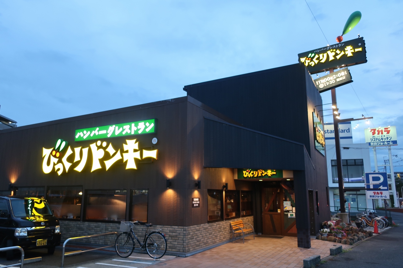 橿原市を通る国道24号線の光山橋北詰交差点近くにあるハンバーグのファミリーレストラン店です。橿原で気軽に食べられるレストランを探していたところ全国チェーンのびっくりドンキーがあったので入店。夜7時頃に行くと店内は家族連れの客が多く殆ど満席。チェーン店なのでチーズバーグディッシュを食べましたがチェーン店ですので味はどこの店でも同じそれなりの味です。