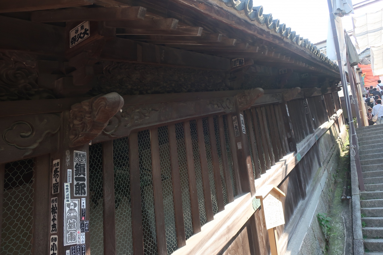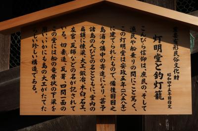 金刀比羅宮の石段を登り出して一之坂の途中168段目付近の左手は商店が途切れ、坂に沿って格子が嵌められたお堂?があります。これが灯明堂です。ほとんどの参拝者は坂を上るにに集中して通り過ぎてしまいますが、よーく見ると中に釣灯籠が並んでぶら下がっています。昼間は中が暗くて、殆ど釣燈篭を見られません。案内板を見ると芸予諸島の浦々構中の寄進だそうです。金刀比羅宮が如何に信仰されていたのかが分かるお堂です。