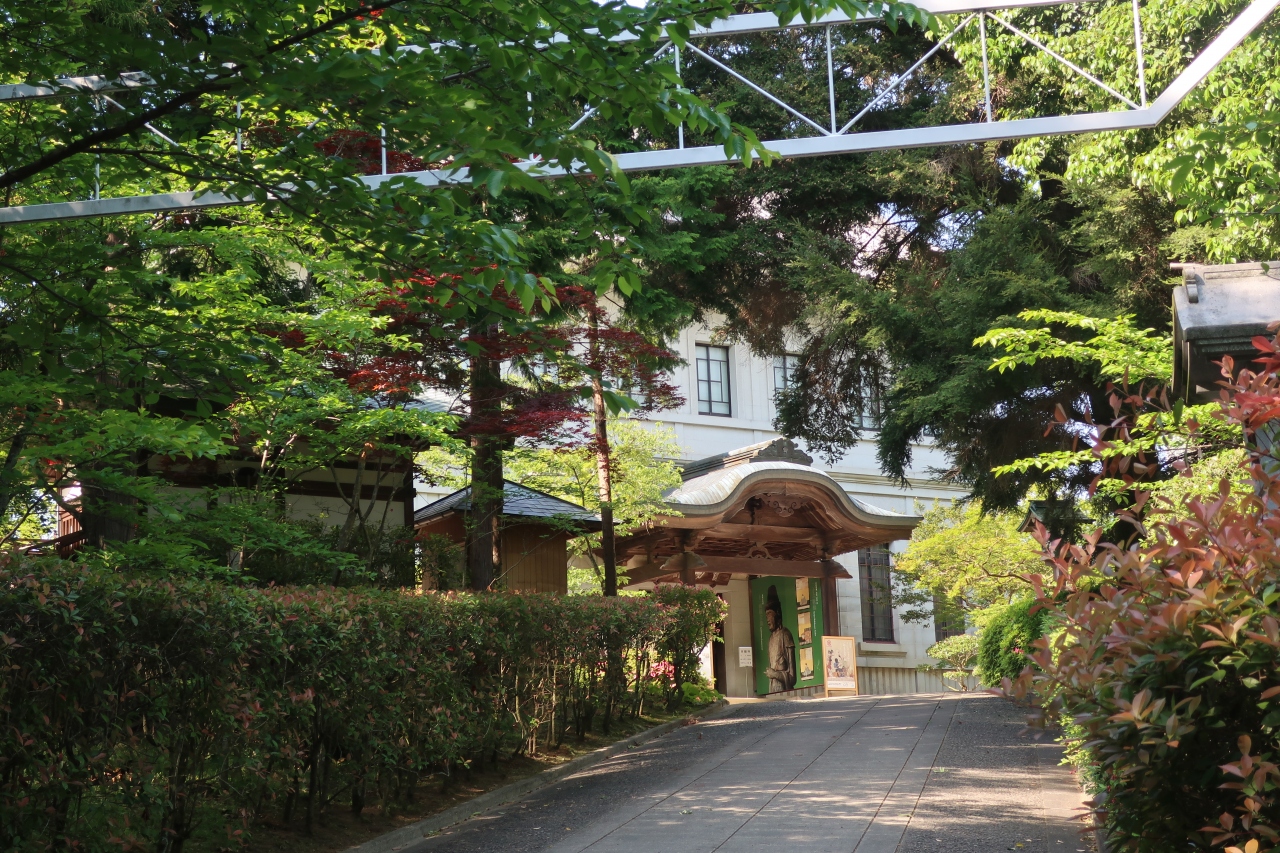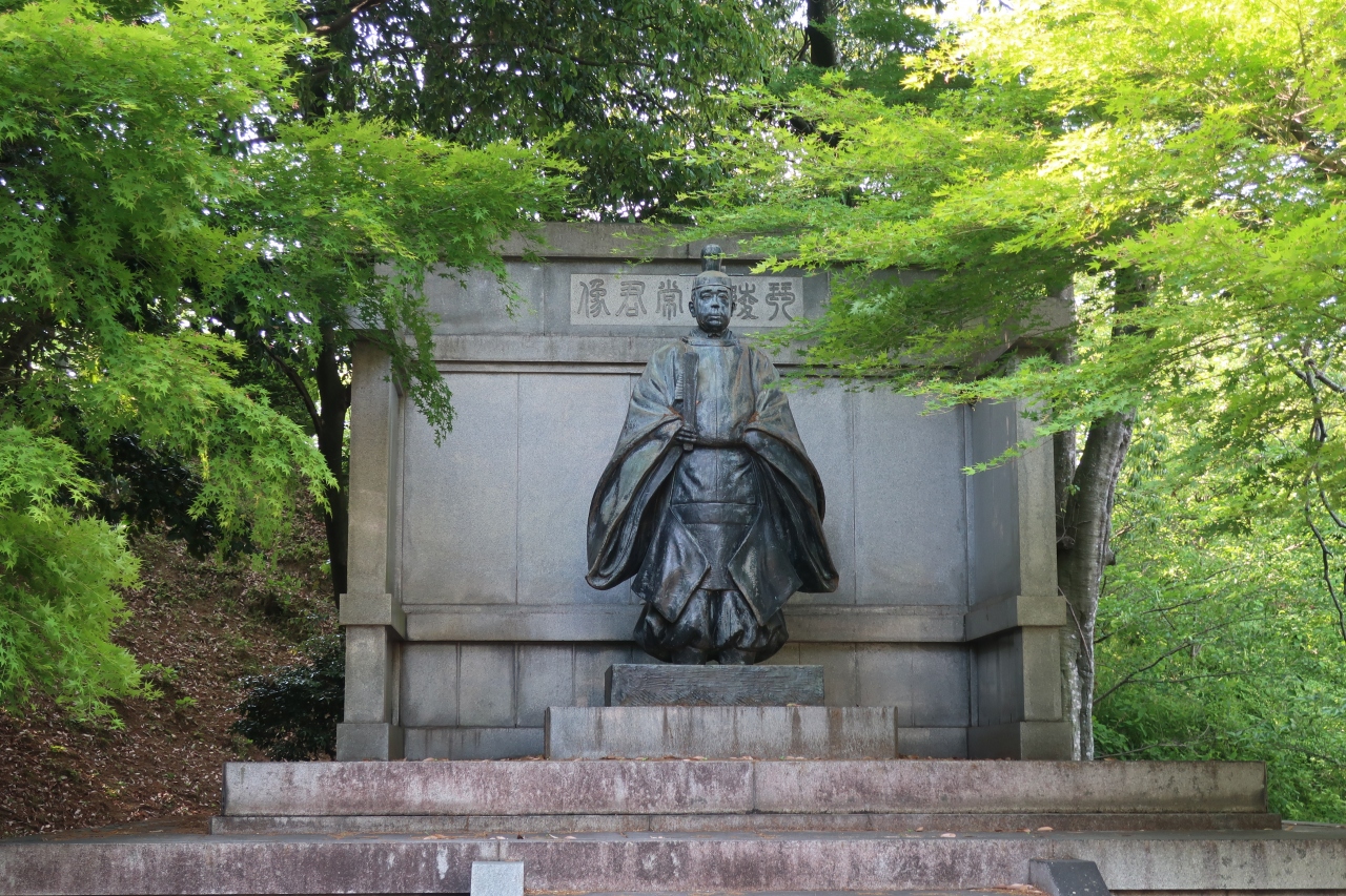 銅像の近くは青紅葉が茂り綺麗でしあ。- 旅行時期