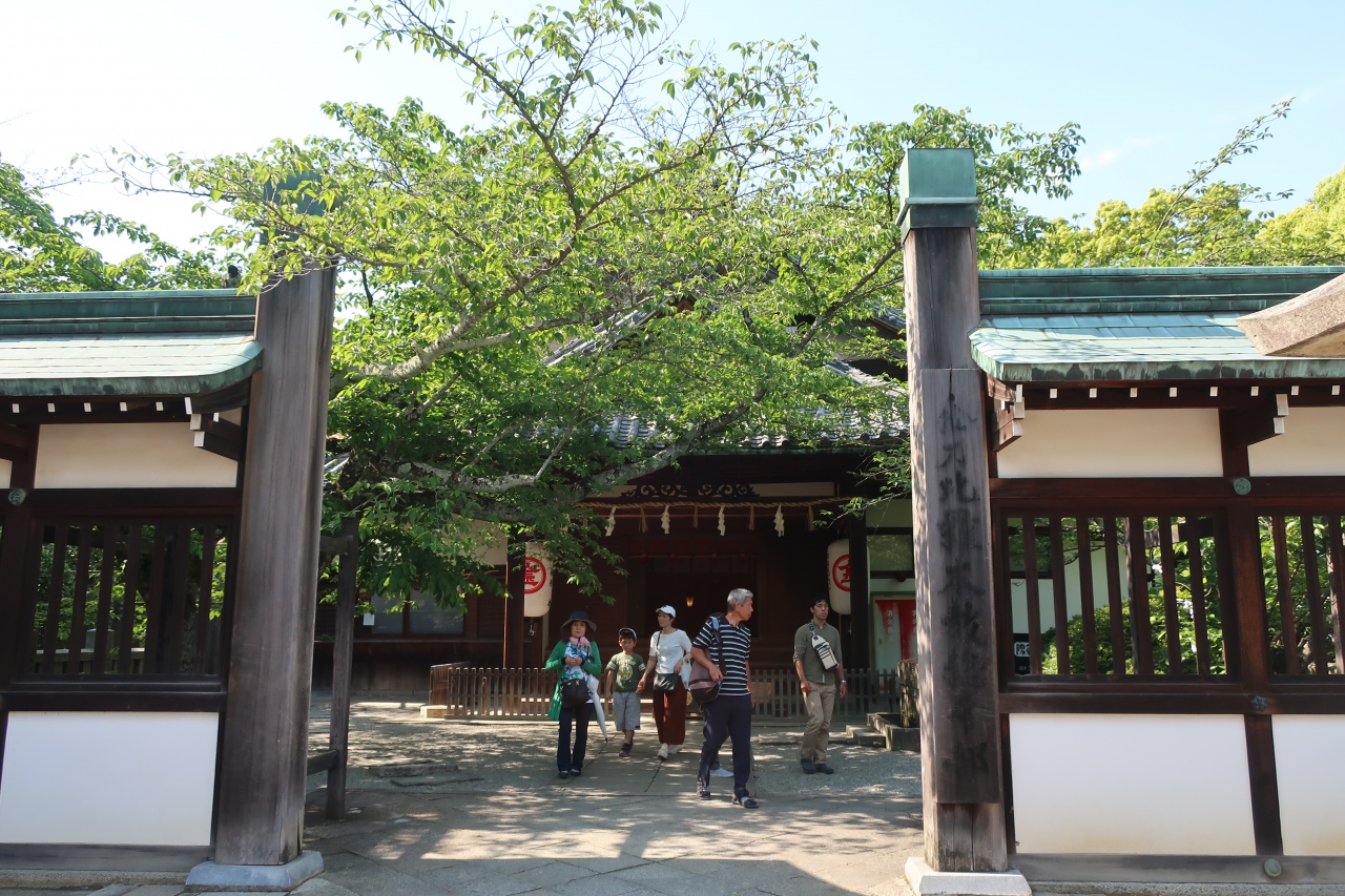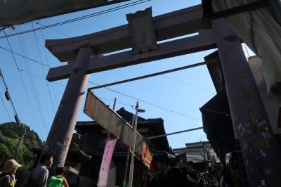 鳥居自体は石造りで、商店の日除けに遮られ見辛くなっています。- 旅行時期
