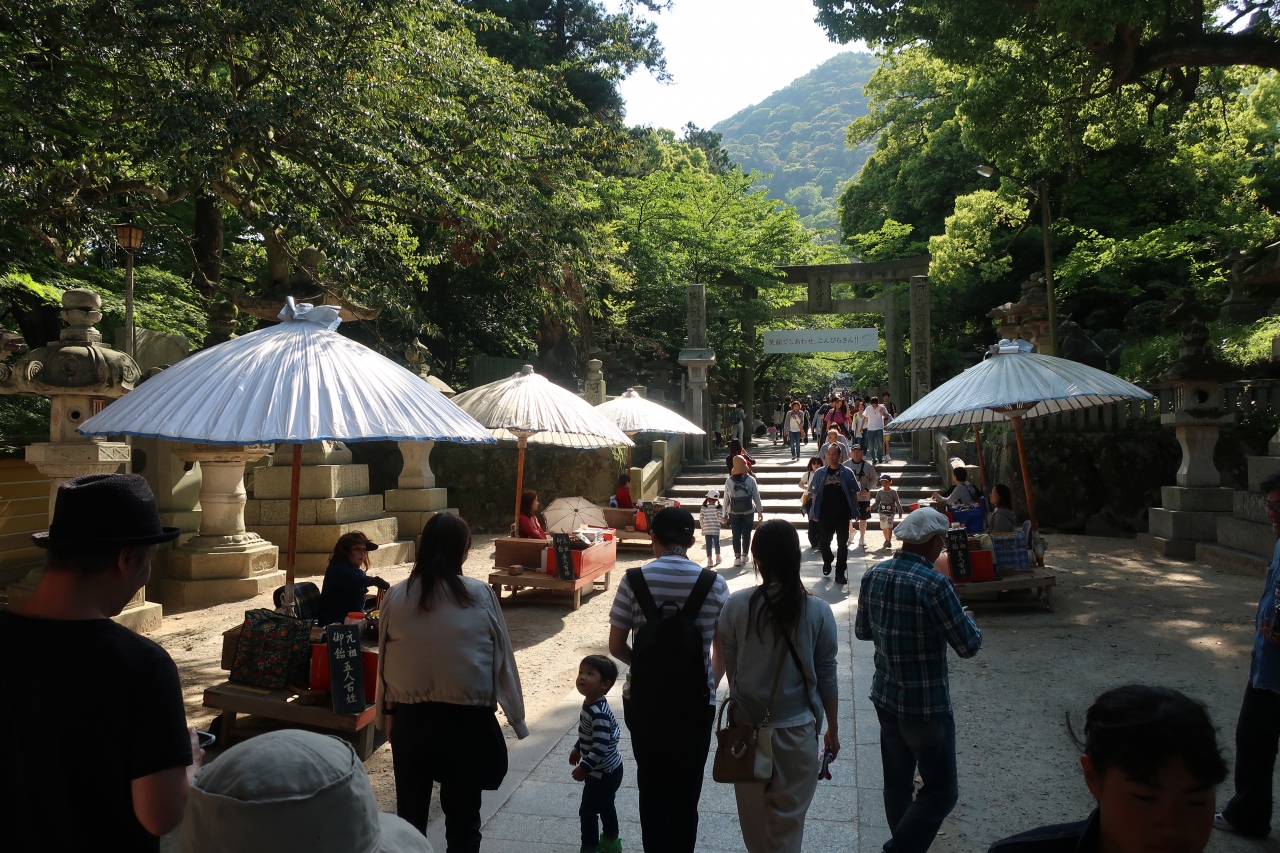 金刀比羅宮の大門を潜り抜けた先に大きな和傘を開いた露店 が5軒参道脇に陣取っています。この露店が五人百姓です。境内の中での商売は禁止されていますが、この5軒は特別に営業を許されている唯一の店です。売られているものは加美代飴と呼ばれるべっこう飴。割れた飴を試食させてくます。歴史のある飴でお土産にも良いですが、夕方には店終いしてしまうので、注意してください。