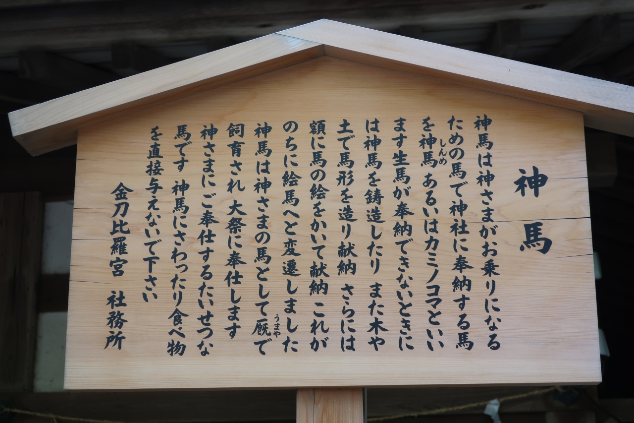 金刀比羅宮の石段を登って429段目、桜馬場西詰銅鳥居の左手の広場の先にある平屋の建物が金刀比羅宮 御厩です。神様が乗る馬である神馬を飼育する厩が御厩です。良く見かけるのは馬の像が置かれている神社が多いのですが、ここには本物の白馬、月琴号が居り、結構人だかりができていました。13才の可愛い馬ですが、ここまでわざわざ連れて来るとは凄いです。