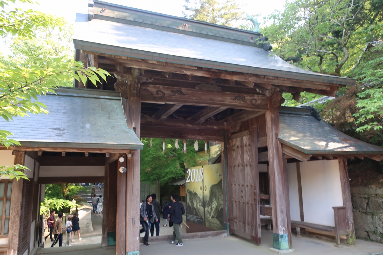 金刀比羅宮 桜馬場西詰銅鳥居の奥にある急な石段を上った477段目にある広場の右手に金刀比羅宮 社務所門があります。社務所門の奥には書院が控え、社務所門は書院の勝手口に当たる門なのですが、社務所門と名が付いているのは、かつて書院に社務所が付属していたからだそうです。勝手口にしては立派な門で門越しに見る書院の式台は重厚な雰囲気があります。