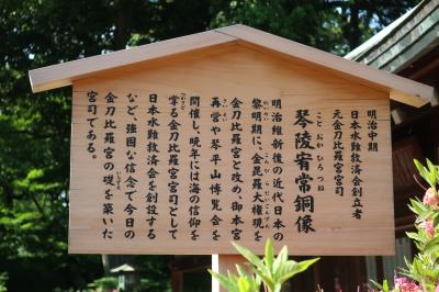 金刀比羅宮の一之坂の石段の途中288段目、右手の奥の石造りの舞台の上に、宮司の姿をした銅像が建てられています。これが金刀比羅宮 琴陵宥常銅像です。「ことおかひろつね」という江戸後期から明治期の宮司で、御本宮の再建、金比羅大権現から金刀比羅宮」に名を変えるのに尽力された宮司だそうです。