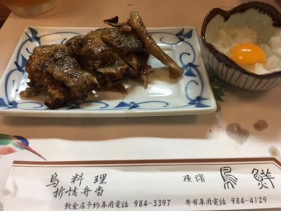 土曜の6時に行くと余り客は居ませんでした。焼き鳥数本、モモ揚げ、鶏皮、釜飯等を注文。入口近くに焼場でご主人が丁寧に鳥を焼いてくれます。当然鶏料理ばかりなのですが、特に美味しかったのは鳥皮とモモ揚げ。鳥皮はウズラ卵の乗った大根おろしが添えられており、和えて頂くと抜群に美味しいです。モモ揚げは食べ応えがあり、空揚げとは違った味付けでかぶりつきたくなります。