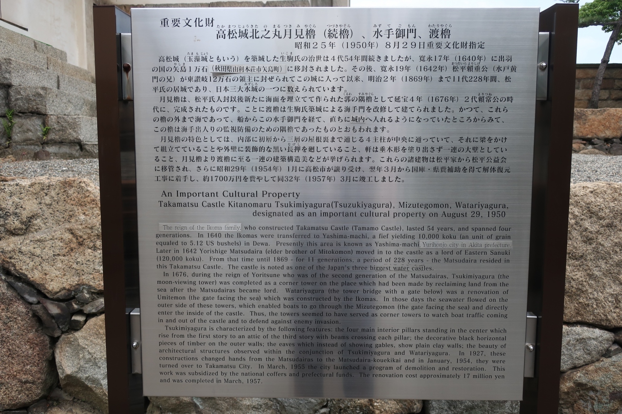 玉藻公園 披雲閣の北側にある海側に残る高松城の櫓です。海の大手門にあたる水手御門と渡櫓とこの月見櫓は高松城の中でも一番見栄えのする建物で、すべて重要文化財に指定されています。陸の大手門にあたる旭門側と比較して見ると面白いです。