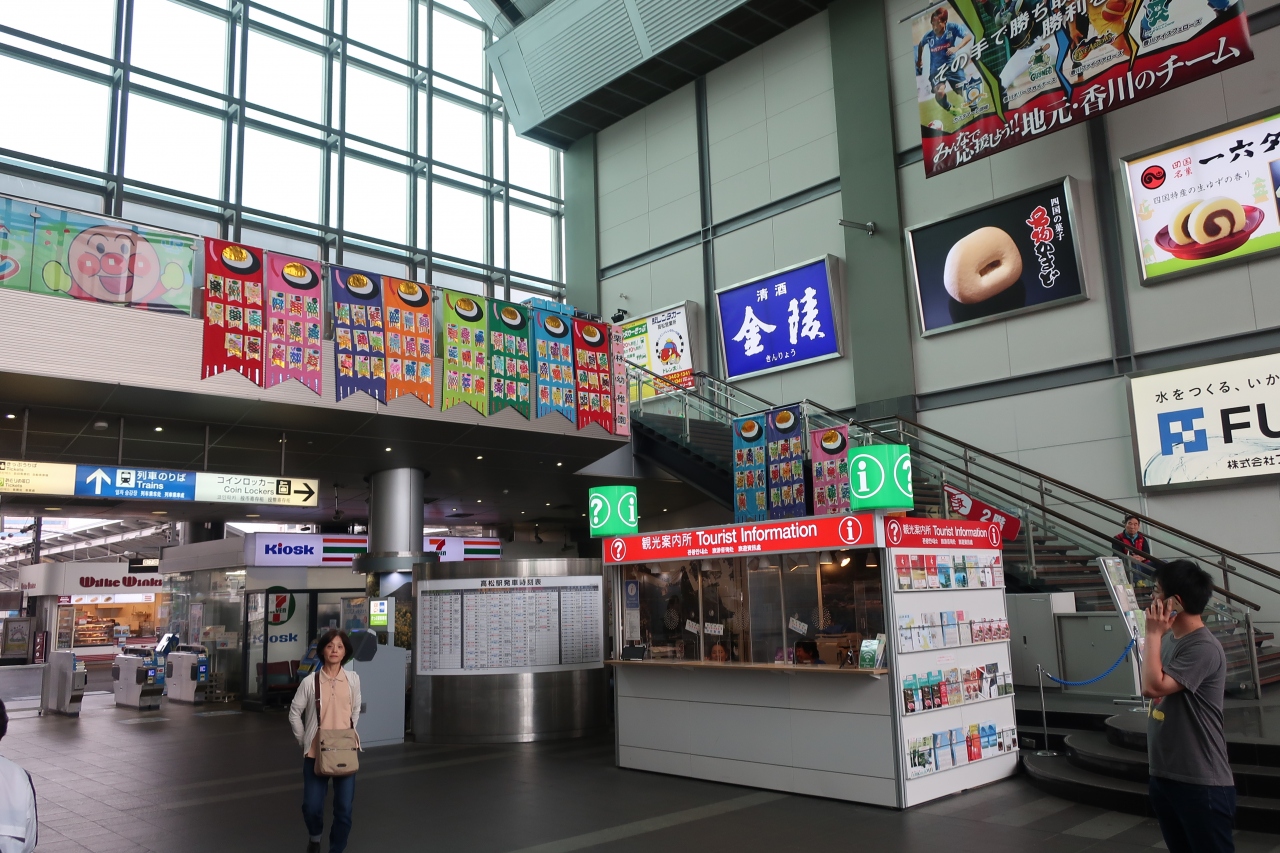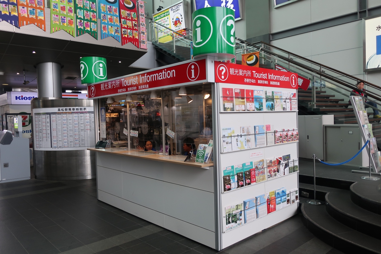 駅を出た正面バスターミナルに高松市インフォメーションプラザがありますが、高松駅構内 改札前コンコースに高松市インフォメーションサテライトがあります。以前はみどりの窓口横にあったようですが、移転して目立つ場所に移ったようです。