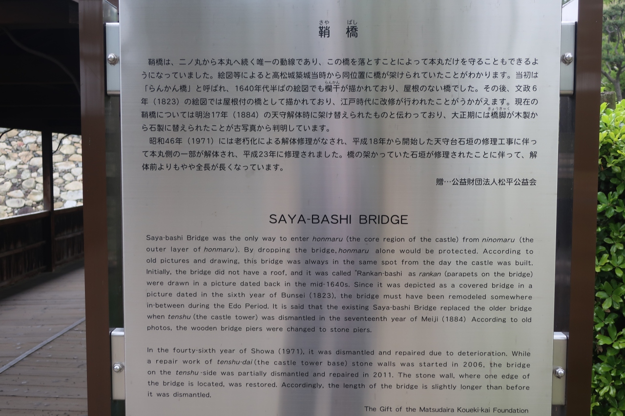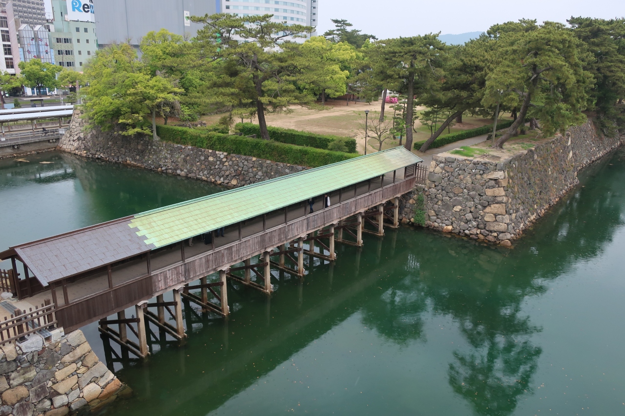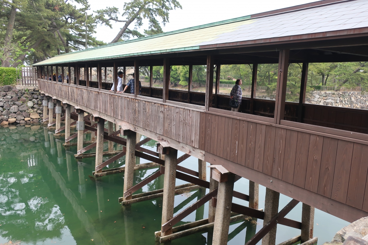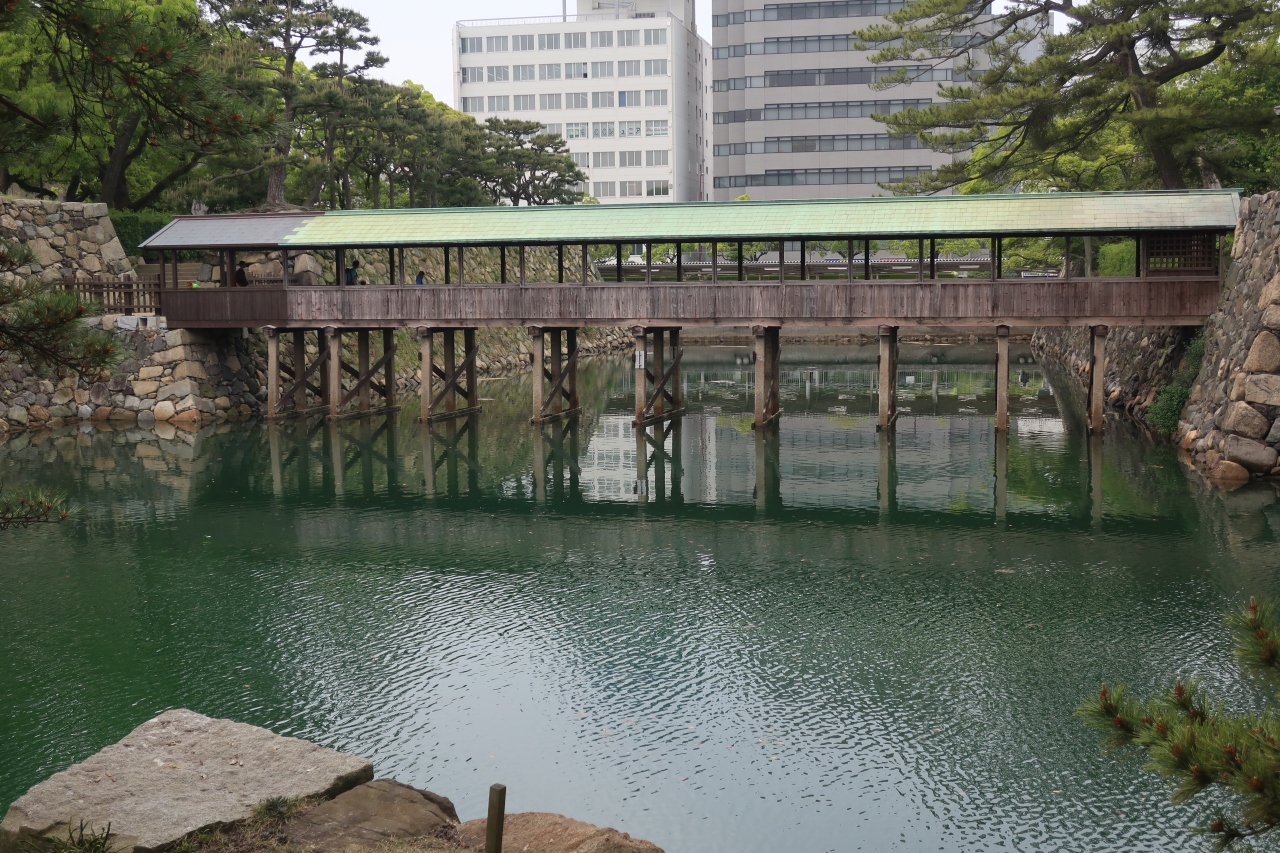 玉藻公園(高松城)の高松駅に近い入口から入り右手に行った先に高松城 鞘橋があります。鞘橋は他の城では見たことが無い屋根付きの木造の橋で、高松城の天守台に渡る唯一の橋は橋を落とすと天守に渡ることが出来なくなり、防御上重要な橋だったことが良く分かる橋です。