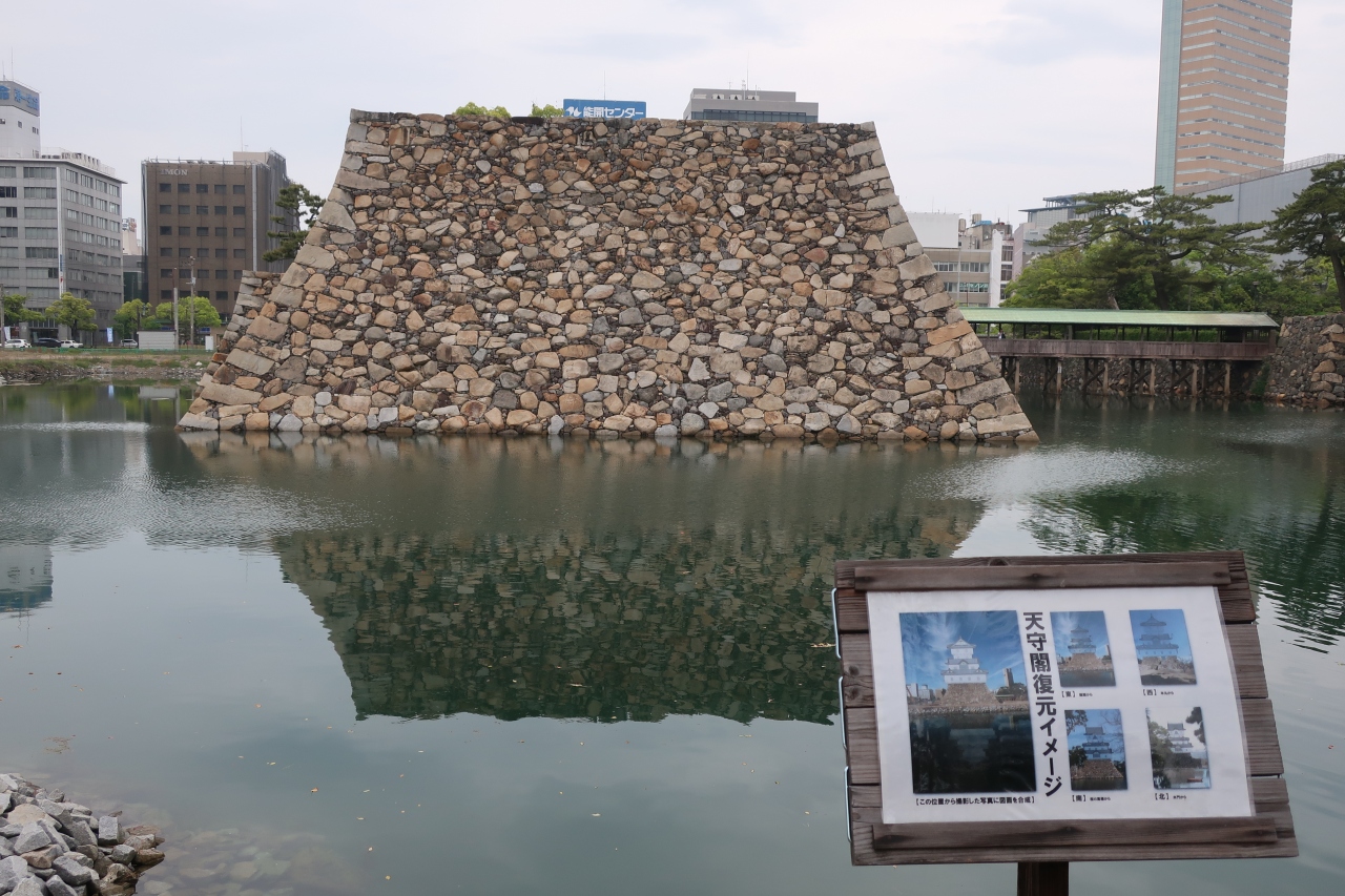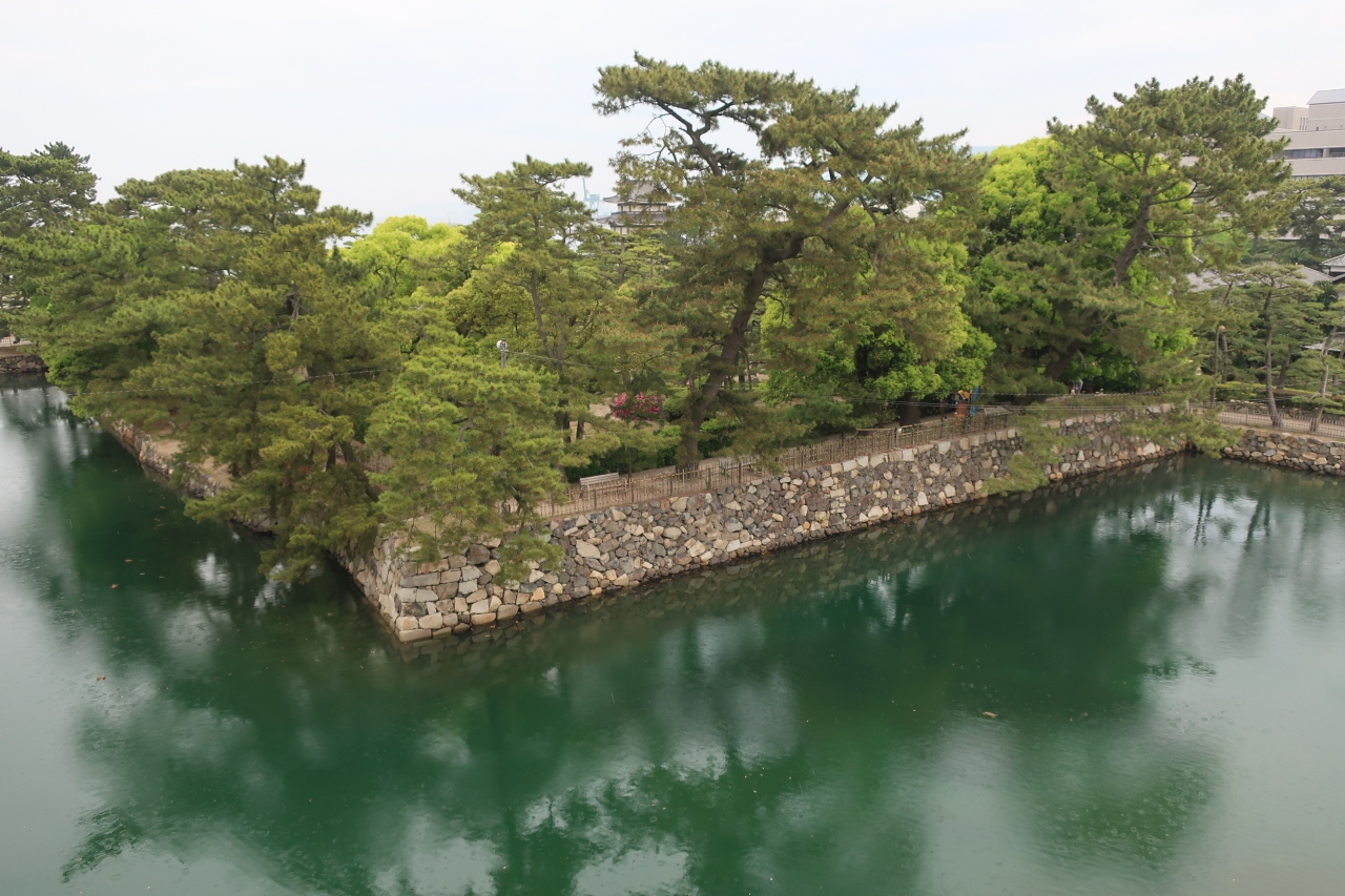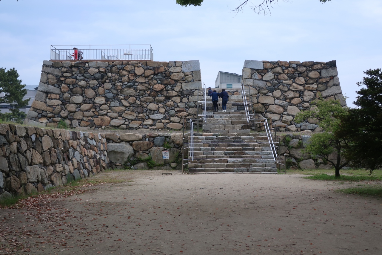 玉藻公園の鞘橋を渡った先にある新しく作られた様に見える石垣が高松城の本丸天守台です。天守台には上がることができ、上ると外からみると分かりませんが、掘り下がった地下に天守閣の礎石が残っています。そこから石垣の上に上ると玉藻公園の全景の先に内海を見渡すことができる絶景ポイントです。