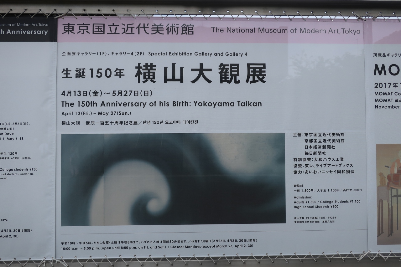北の丸公園の竹橋にある国立の美術館です。生誕150年を迎えた横山大観の展覧会を見に行ってきました。土曜の12時に行くと並ぶことなく入館できましたが、展示室での観覧は並ぶ必要があり、結局全部見て回るのに1時間半掛かりました。「夜桜」「紅葉」「生々流転」等の名作を一堂に会した素晴らしい展覧会でした。