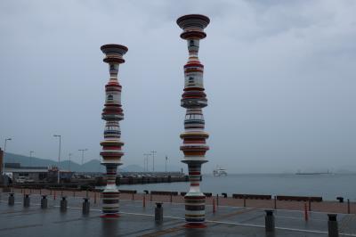 高松港旅客ターミナルビルから渡り通路を高松港に入った先に立つ2本のアート作品がLiminal Air -core-です。10m近くある柱は凹凸があり、鏡面の表面はカラフルに彩色され、周りの物が映り込んで、さまざまな面白い姿がみられるアート作品です。高松港のシンボル的なモニュメントです。