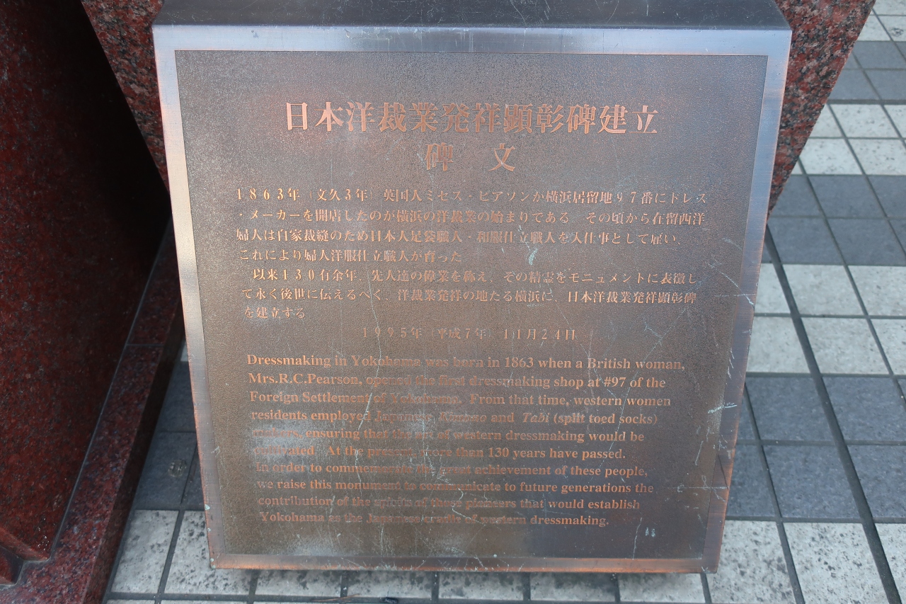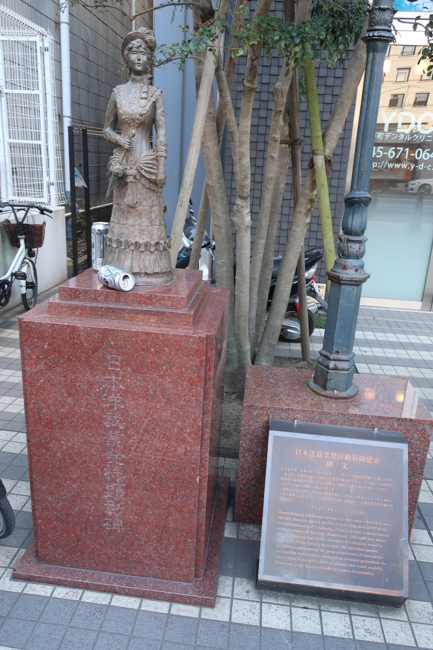 みなとみらい線の元町・中華街駅3番出口近くのマンション前の敷地に貴婦人の像が建てられています。これが日本洋裁業発祥顕彰碑です。1863年に英国人ピアソン夫人が居留地97番地にドレス・メーカーを開店したのがこの地に近いことから、それを記念して建てられました。碑自体は可愛いのですが、碑の周辺は自転車置き場化しており、自転車をどかさないと碑文が見られない程目立ちません。
