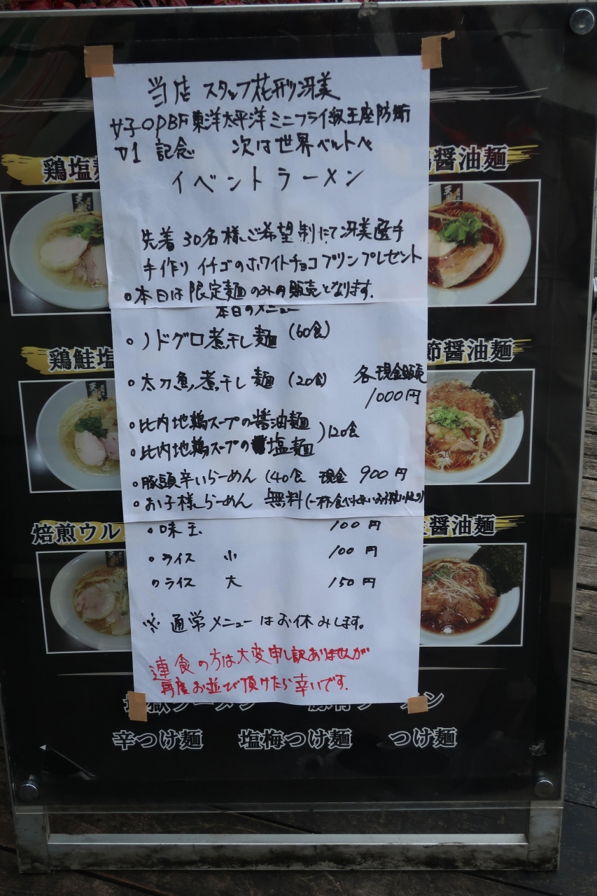 鶏白醤油採麺を食べようと思っていたのですが、行ったその日はお店のスタッフで女子ボクサー花形冴美さんの王座防衛記念イベントのイベントラーメンだけの日でした。頂いたのは比内地鶏スープの醤油と塩。具のチャーシューは別皿で出て来ます。ラーメンは円やかなスープにストレート麺ととてもシンプル。味わいのあるラーメンが美味しかったです。- 旅行時期