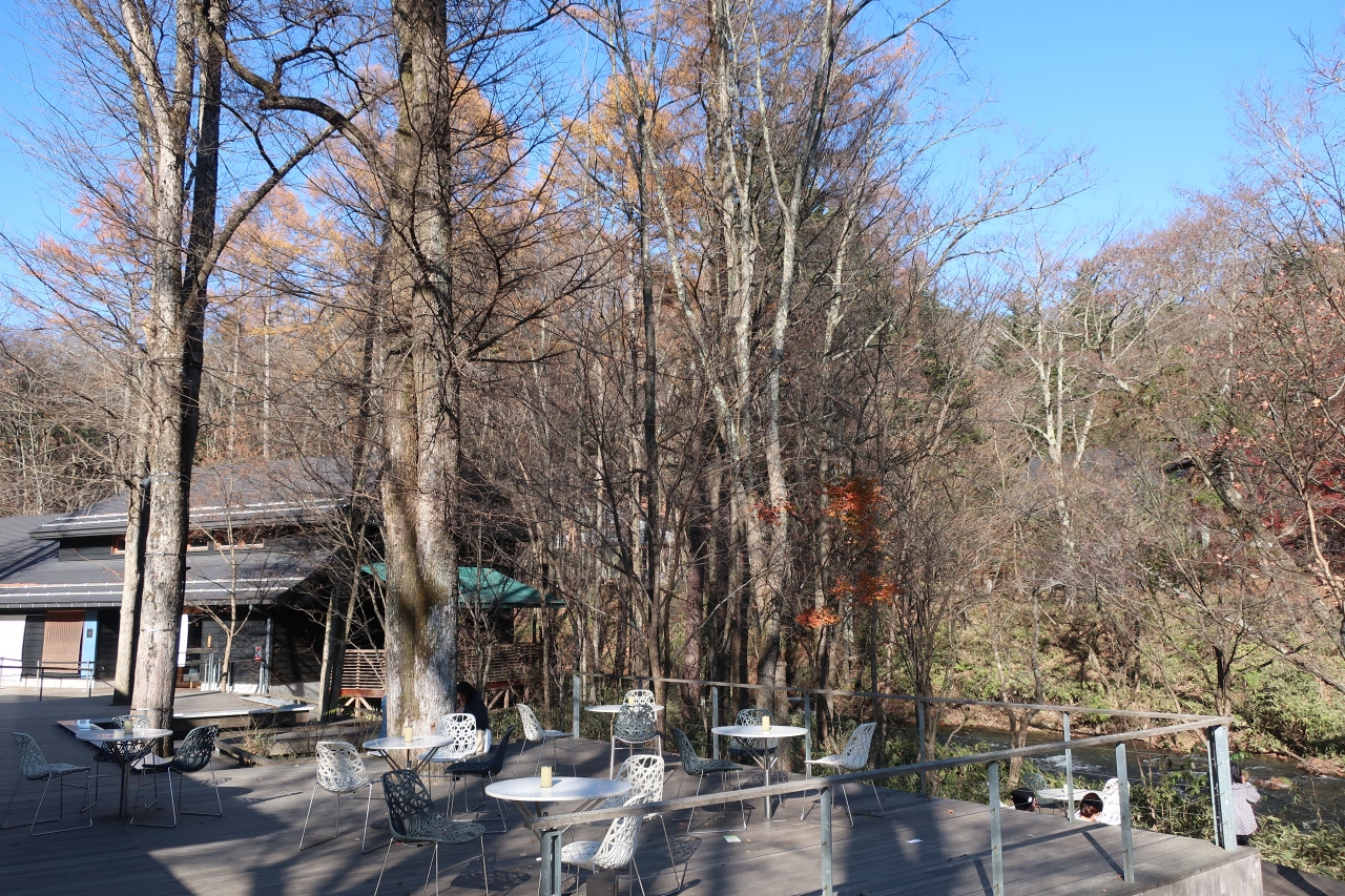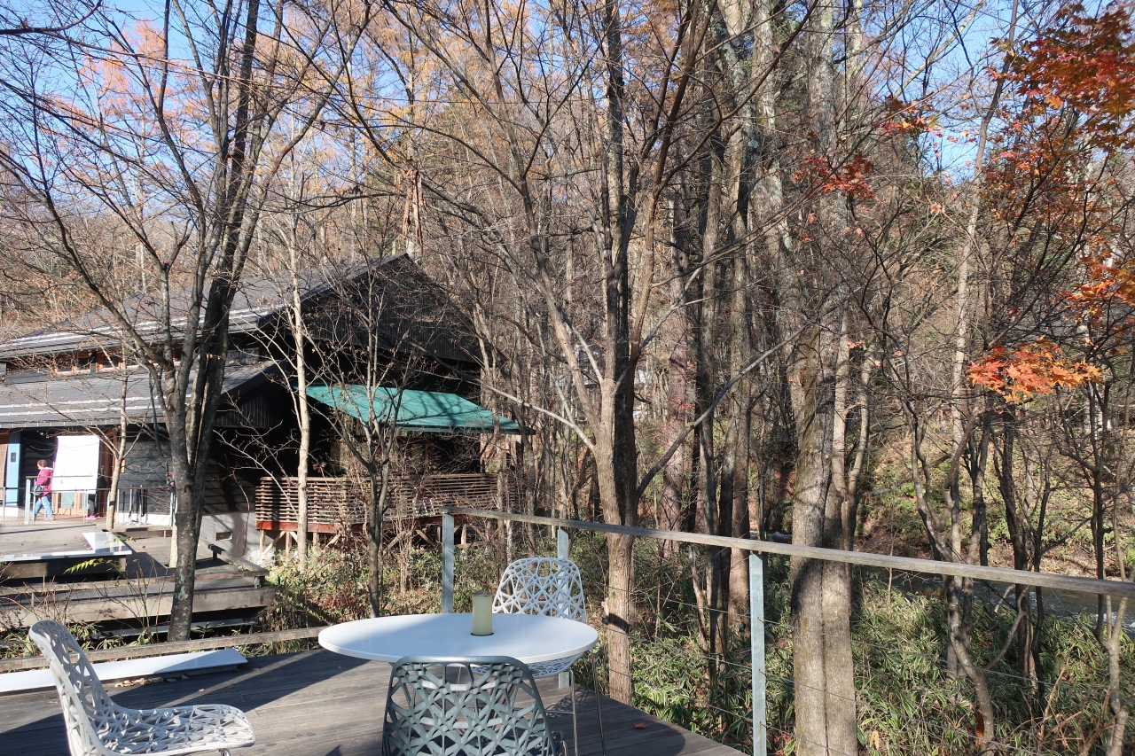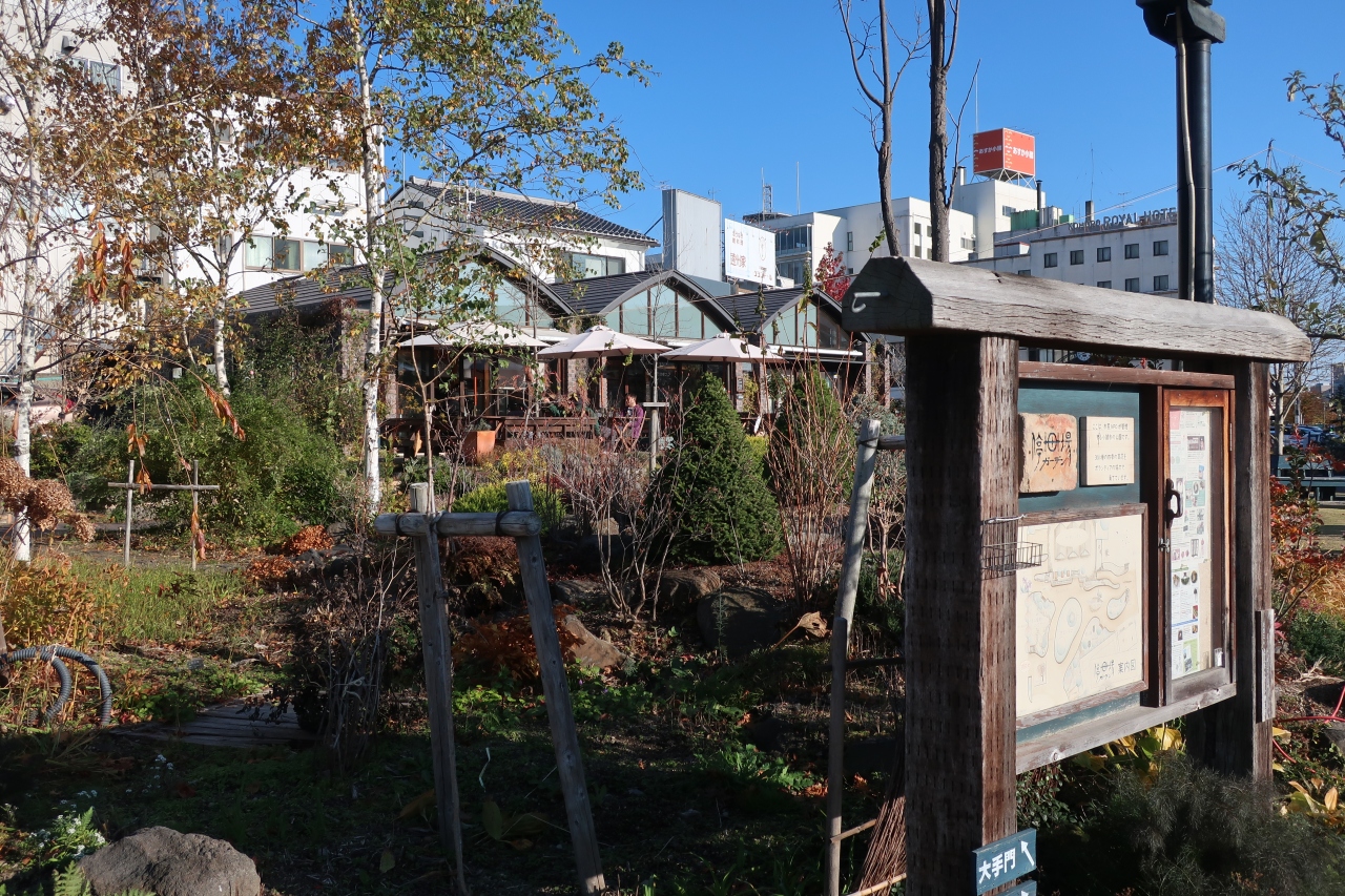 小諸駅の改札を出てすぐ、駅の東側に停車場ガーデンがあります。手入れされた庭園にテラス付きのショップ&カフェが併設されています。秋で花は殆ど咲いておらず、紅葉した木々が青空に映えます。店内ではお菓子、はちみつ、ガーデン用品が販売され、カフェではお茶の他軽食も食べられるので、電車待ちに一服するのに最適です。気持ちの良いカフェです。