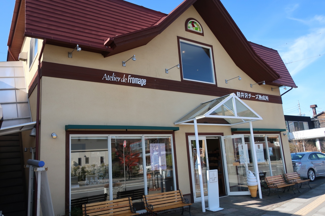 軽井沢駅の北口から中山道を越え500m程北に入った所にアトリエドフロマージュ軽井沢チーズ熟成所・売店があります。店内ではここで作られたチーズを始め、ワイン、ソフトクリームが売られており、2階では熟成中のチーズを見学することができます。