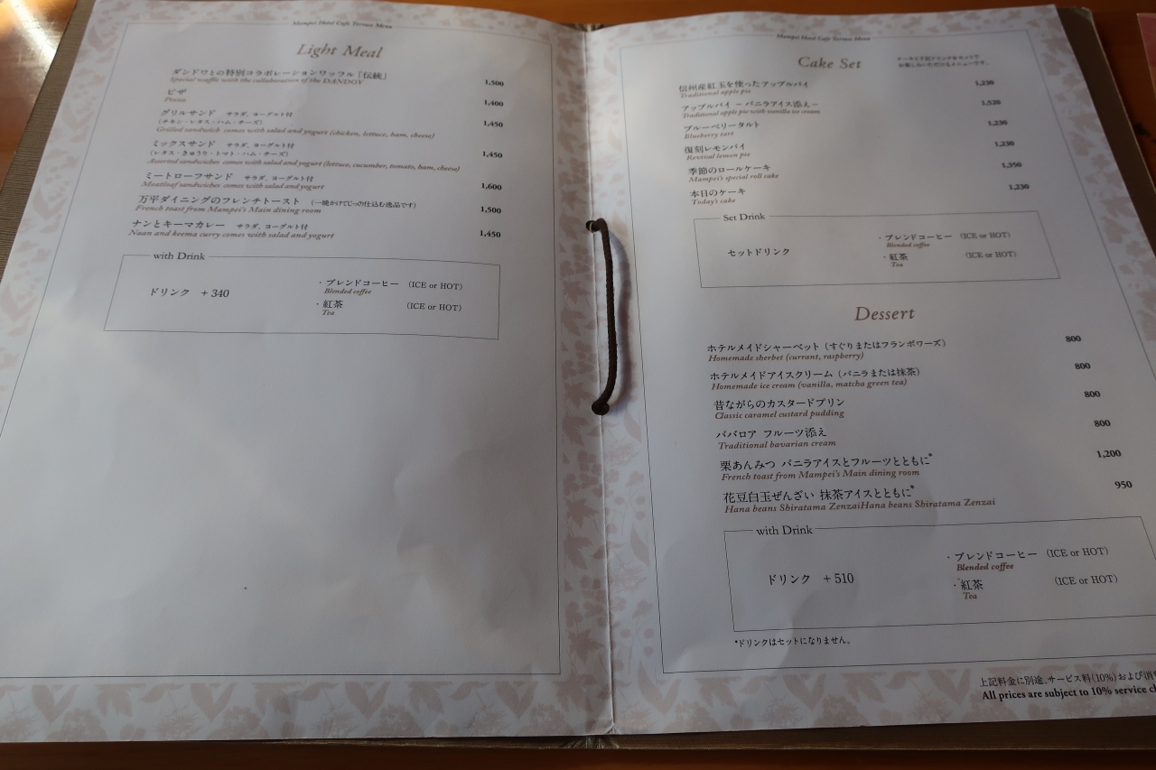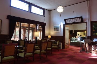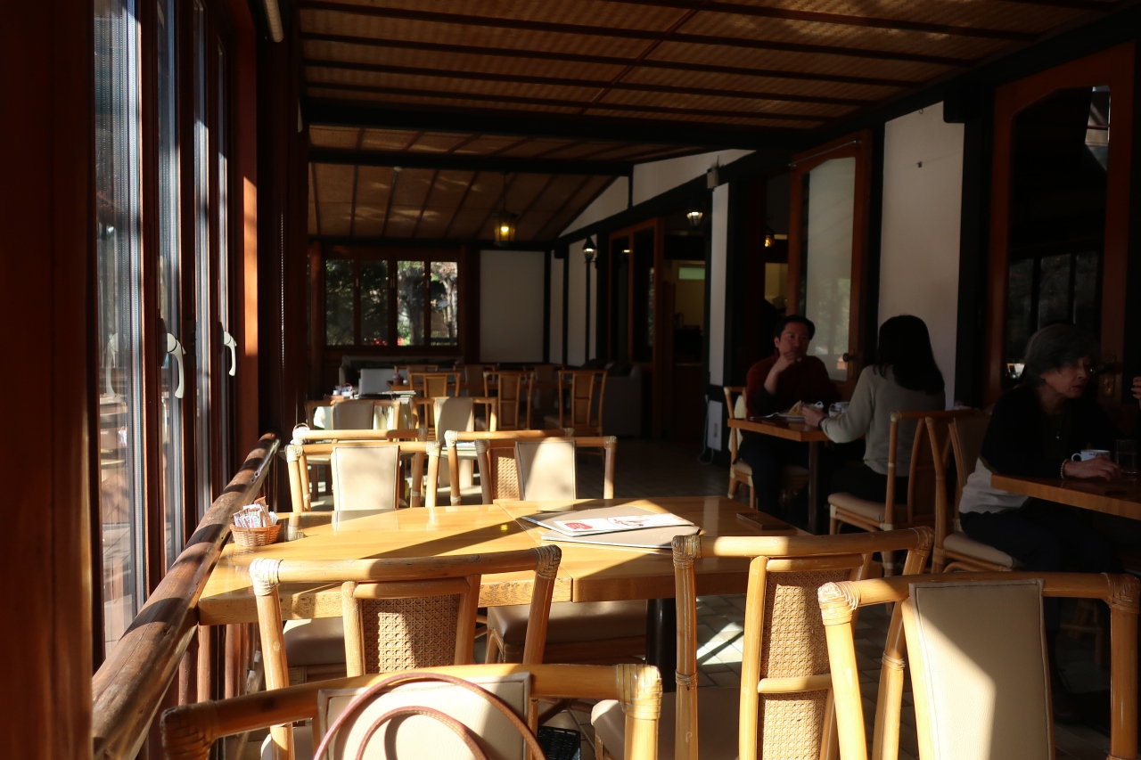 万平ホテルの正面玄関の左手にあるカフェテラスです。店内は外に面して細長く、テラス席もあり、テラス席はペットも同席可能です。