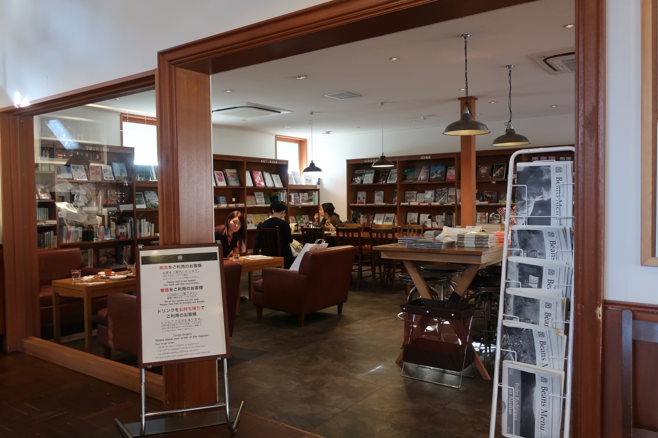 ハルニレテラスの真ん中辺りにあるウッディなお店は奥に椅子の置かれた本屋の中に席が置かれ、本を眺めながらコーヒーを頂くことが出来、蔦屋カフェの様な臣でです。