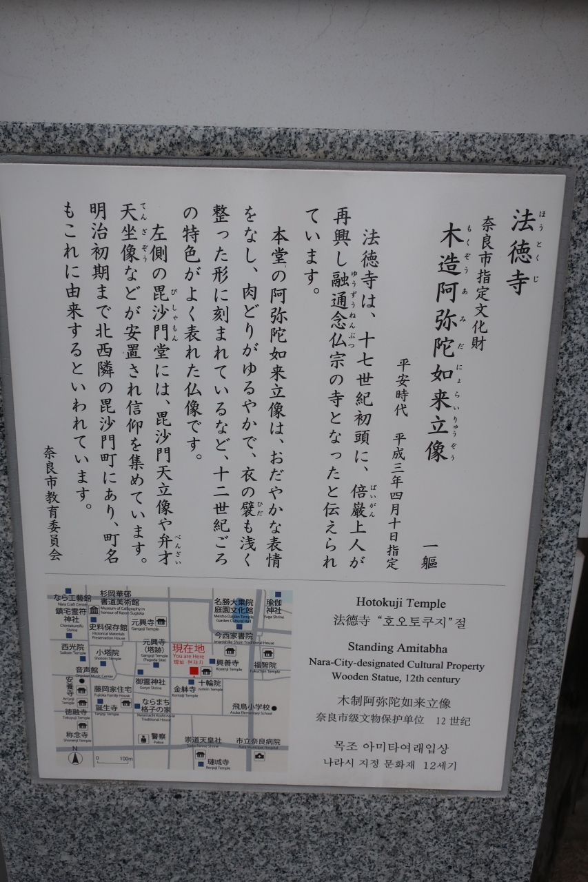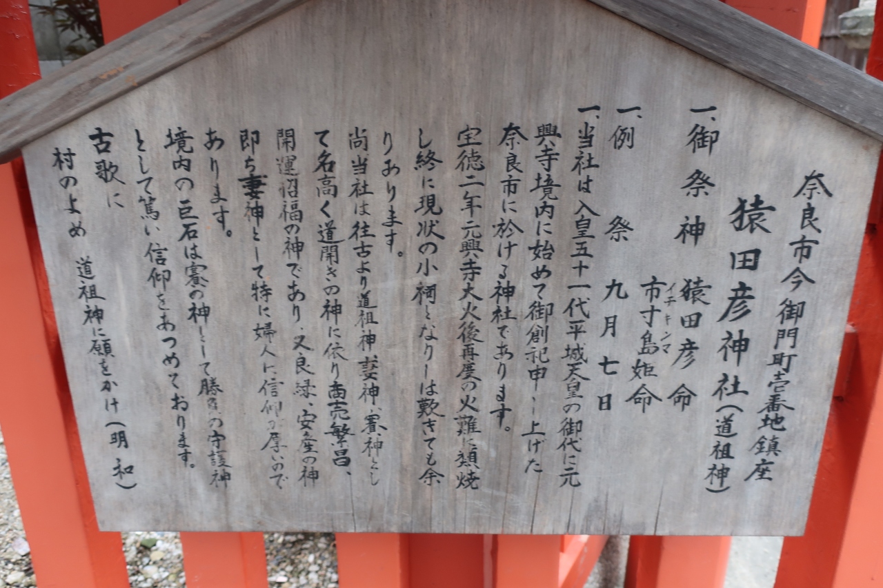猿沢池から奈良町方面に行った今御門商店街と西寺林商店街の交差点近くに猿田彦神社があります。奈良町の道祖神として信仰されてきた神社です。猫の額程の境内には小さな祠が祀られており、その近くに石が祀られ、賽の神として勝負の守護神としてご利益があるそうです。それ以外は見所はありません。