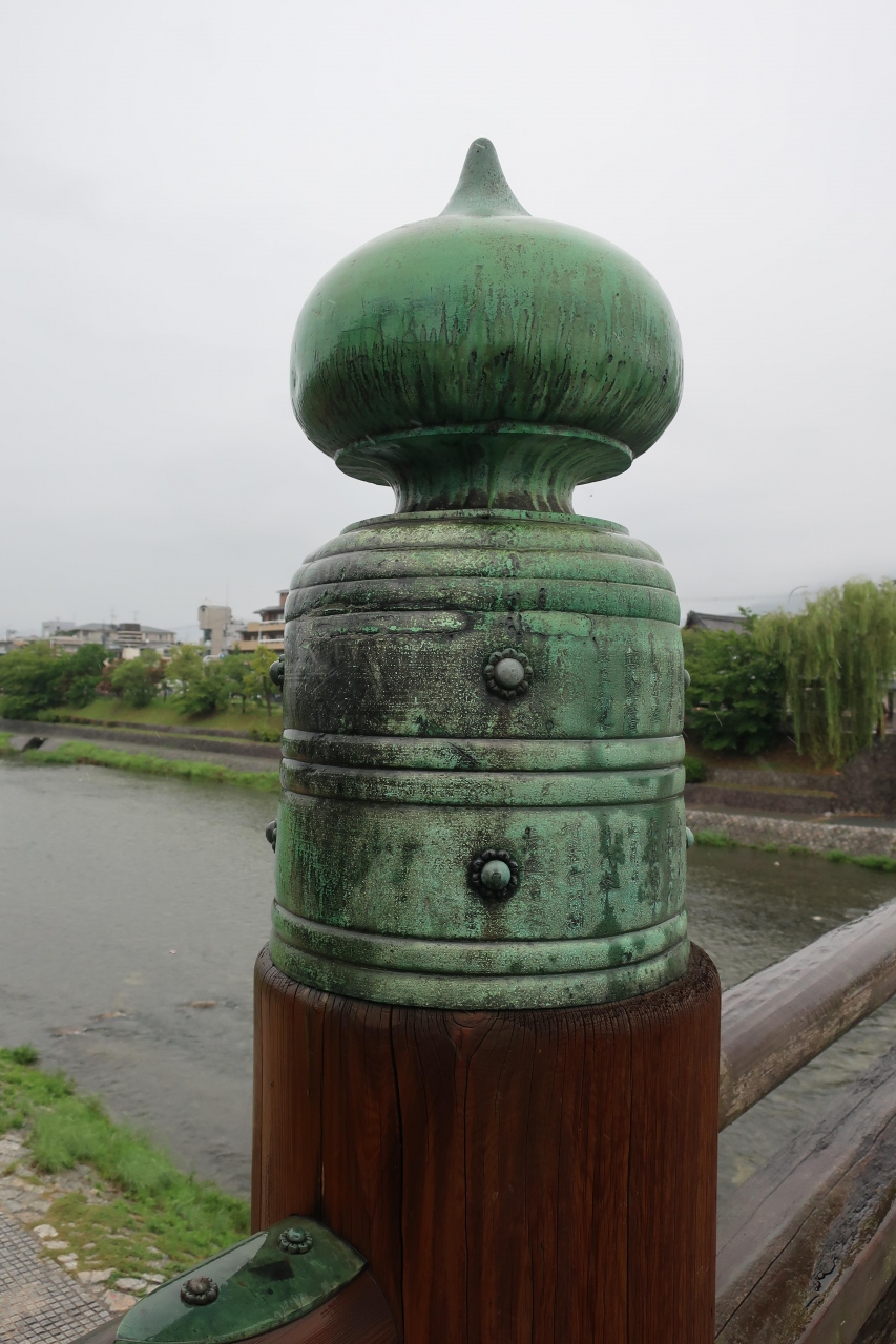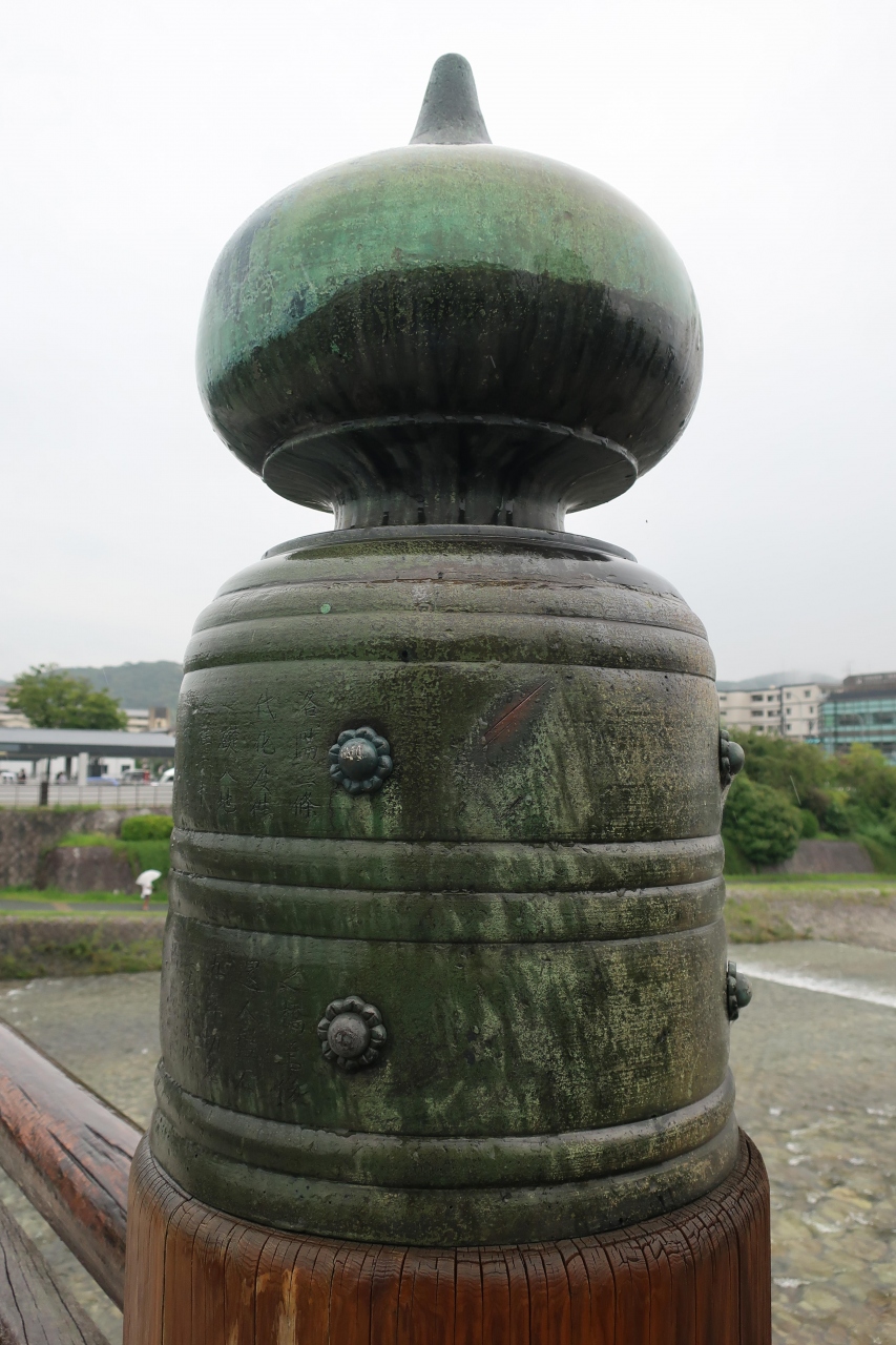 旧東海道の西の終点であった三条大橋の擬宝珠には池田屋事件(1864年)当時に切りつけられた刀傷が残っています。とは言ってもどの擬宝珠か見つけるには大変。南北の西から2つ目の擬宝珠にそれはあります。しかし、よく目を凝らしてみないとこれが刀傷なのか分からないです。北側の方が刀傷は分かり易いです。
