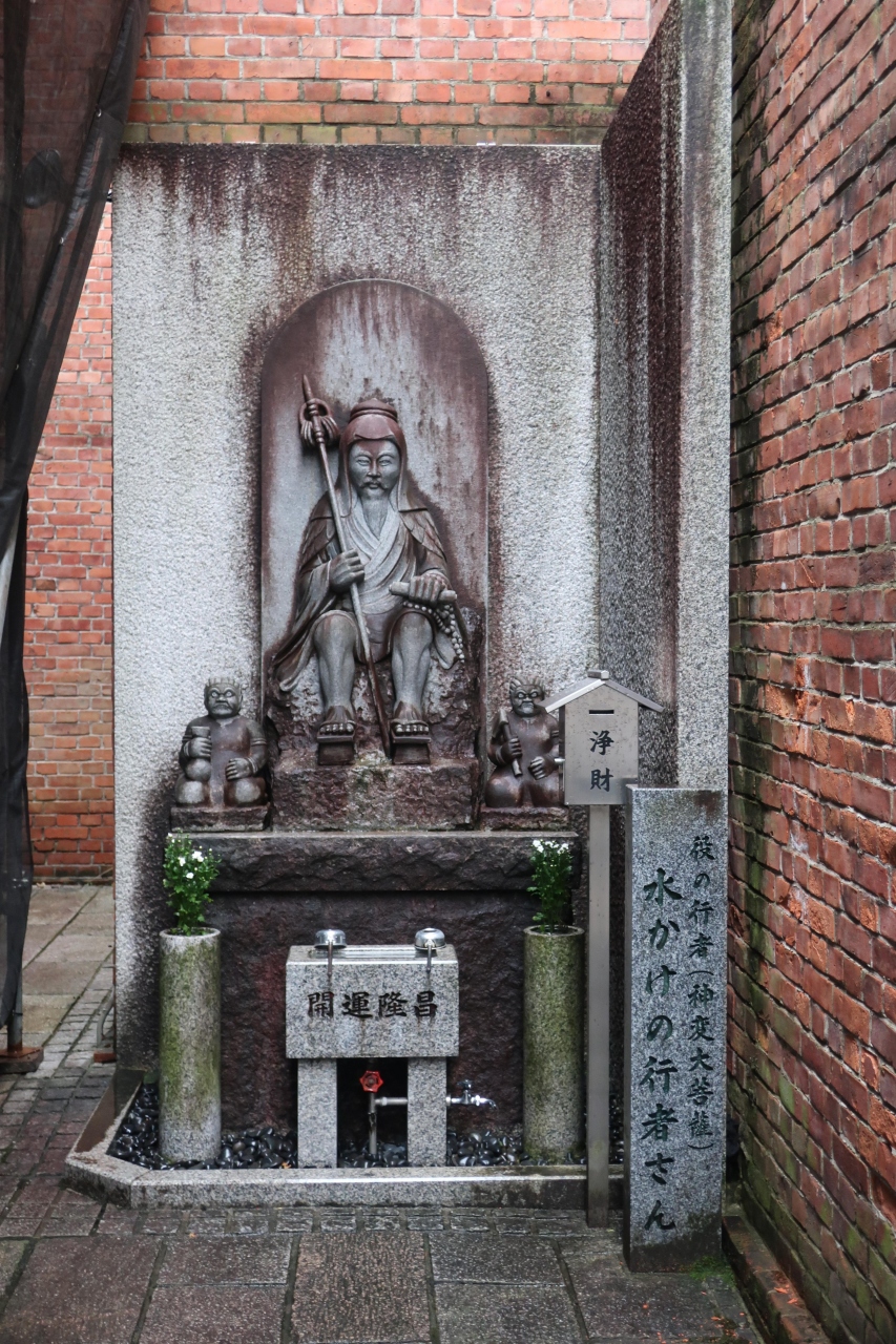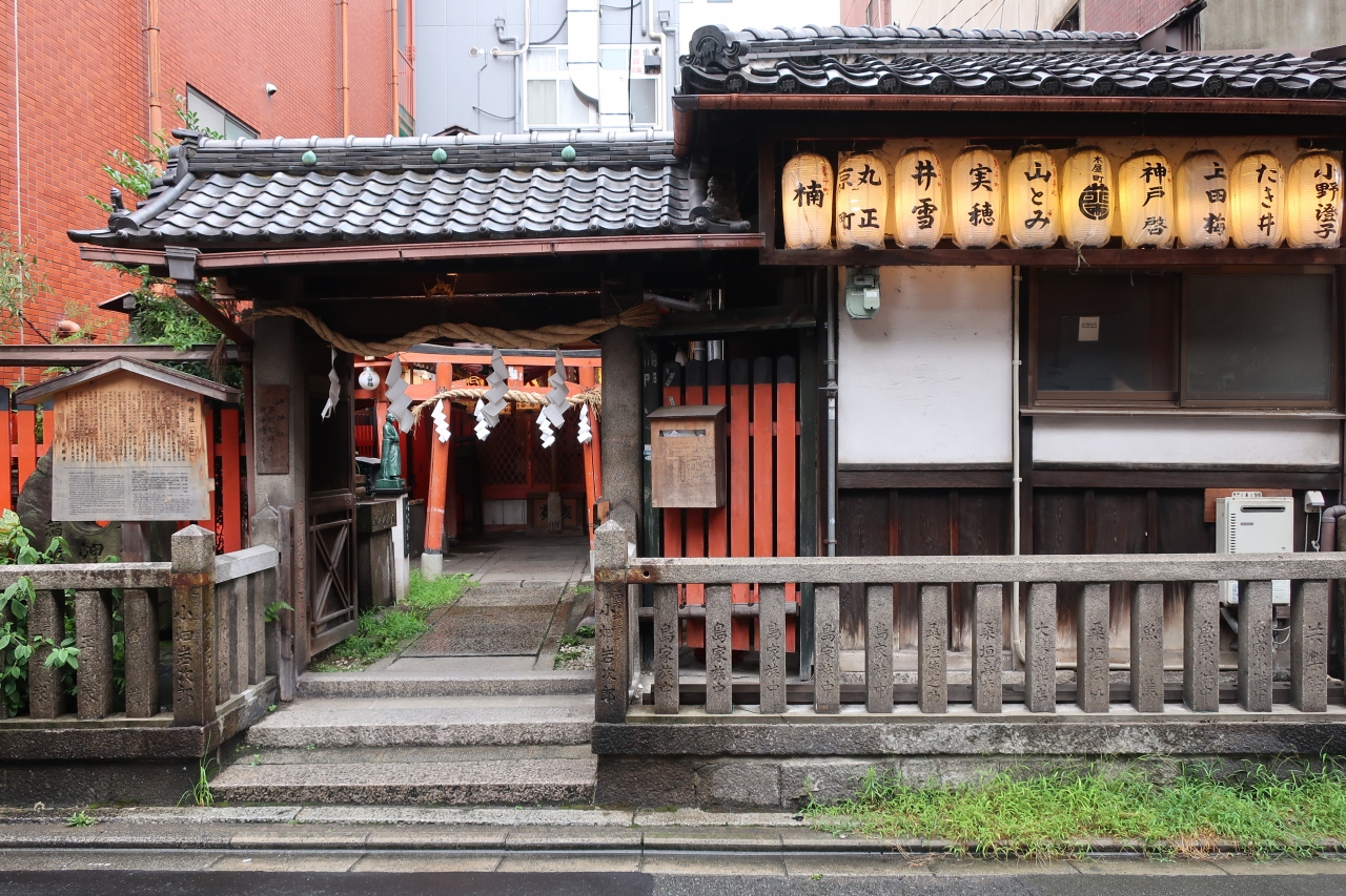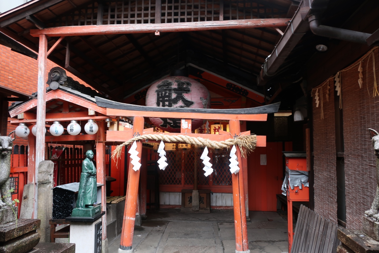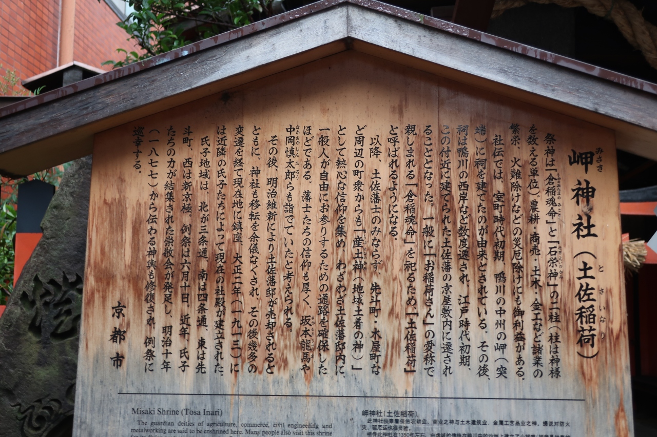 河原町通りから蛸薬師通りを東に入った所に小さな岬神社があります。この周辺は江戸時代末期まで土佐藩の京屋敷があった場所で、この岬神社は土佐藩邸の庭に祀られていた、土佐藩ゆかりの神社です。幕末土佐藩邸に出入りしていた坂本龍馬も崇めた神社であり、境内には坂本龍馬の小さな銅像が立っています。