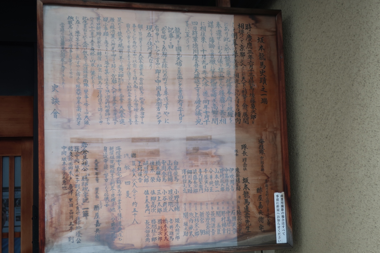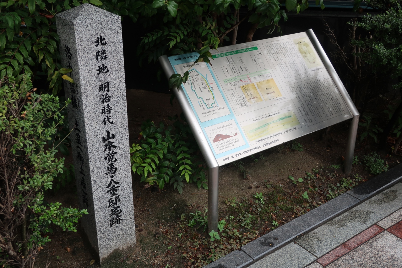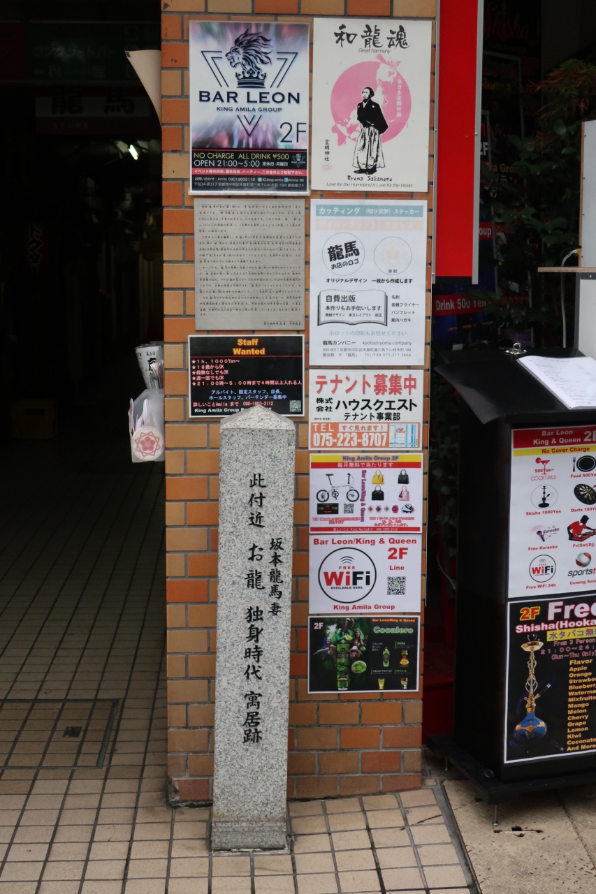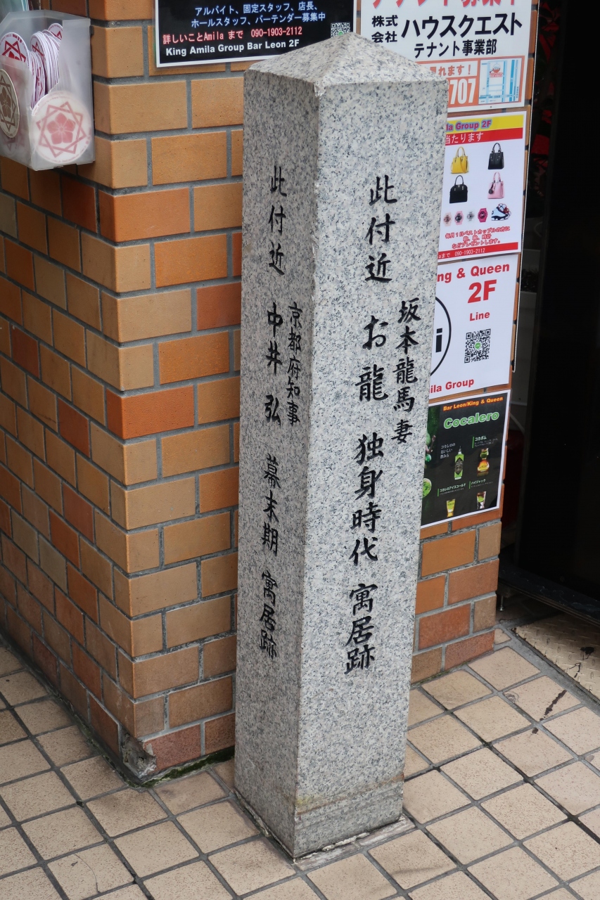 御池通りから木屋町通りを下っていくと、お龍 独身時代 寓居跡の石碑があります。丁度、都会館の敷地内の柱に寄り添う様に立てられています。独身時代ですので楢崎龍の頃です。この周辺には土佐藩屋敷、酢屋、池田屋、近江屋等、坂本龍馬ゆかりの地が多く、龍馬とお龍が出会ったのもこの辺りなんでしょうね。