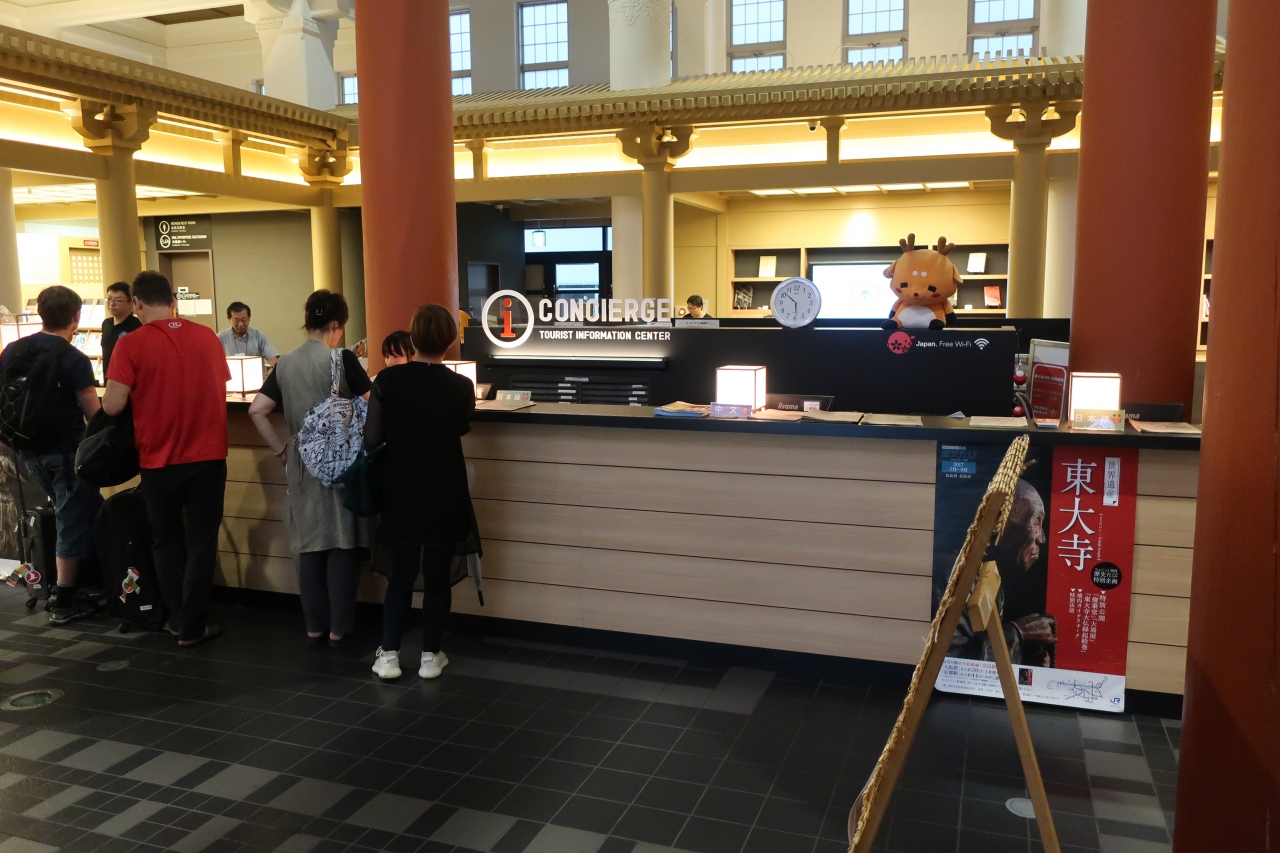 JR奈良駅前にある旧奈良駅駅舎の中は奈良市JR奈良駅総合観光案内所になっております。パンフレットコーナー、手荷物預かり、外貨交換だけではなく、問い合わせ窓口にスタッフも常駐しています。中元万灯籠の時間、行き方等を聞きたかったのですが、外人さんに掛かりっきりで結局聞けず。バスの案内係の人に聞いた方が早かったです。