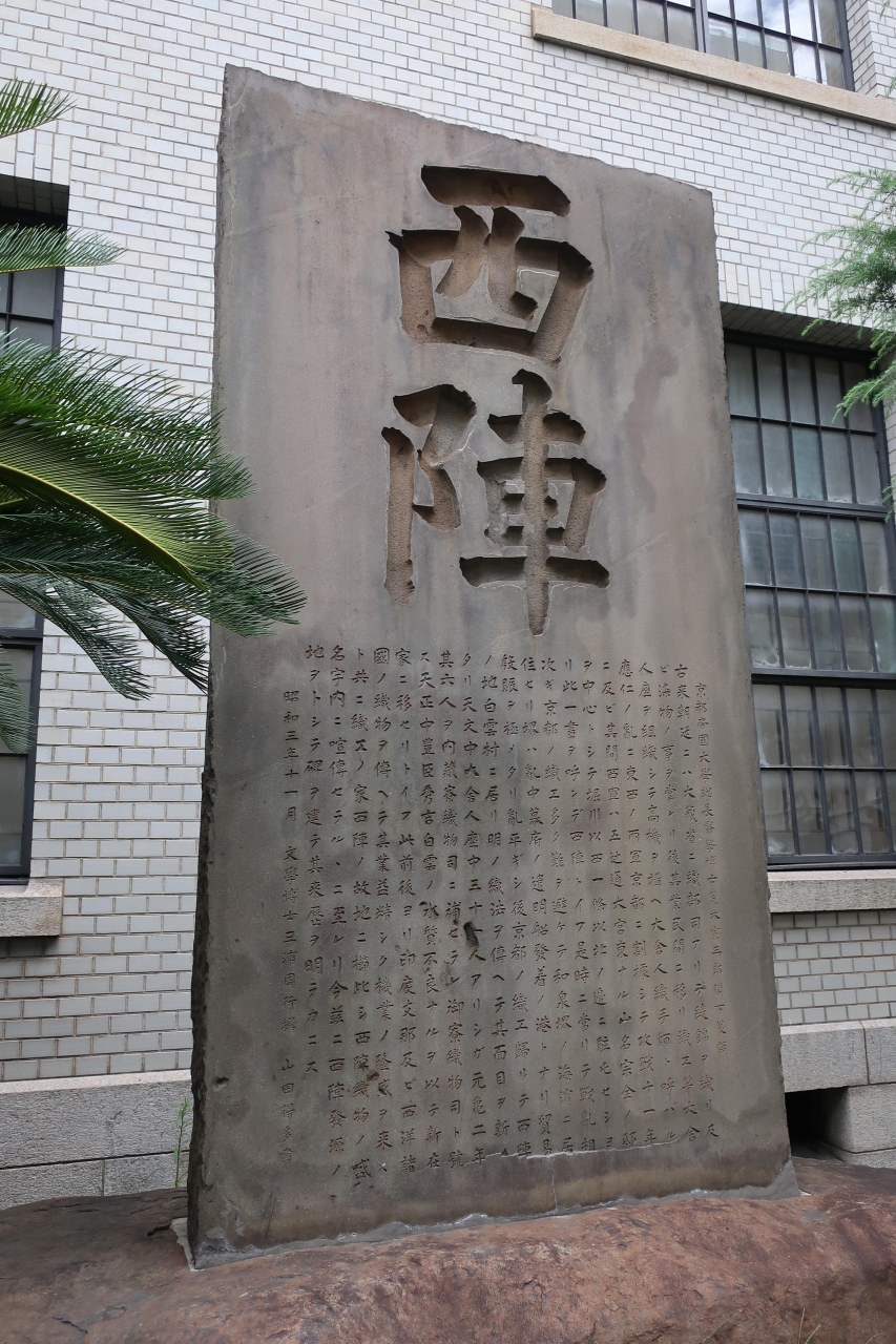 京都の今出川大宮辺りの一帯の地域が西陣と呼ばれており、西陣織で知られる所です。西陣の石碑はそこの京都市考古資料館の前(バス停の後ろ)に建っています。何で西陣と呼ぶのか知りませんでしたが、応仁の乱で西軍が山名宗全の屋敷を中心に陣を張ったことから西陣と言う名が付いたとテレビの歴史番組で見かけて知りました。碑にも同じ様なことが彫られています。
