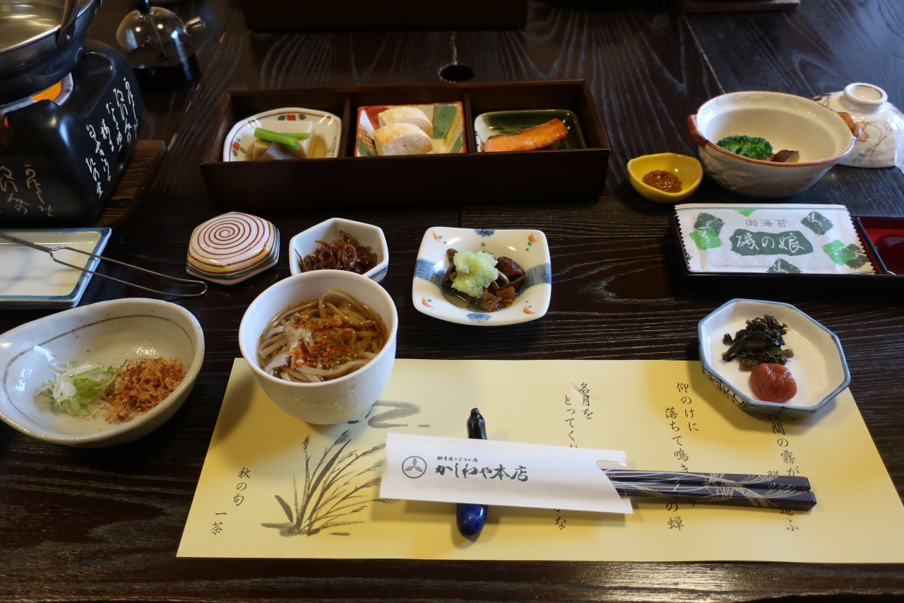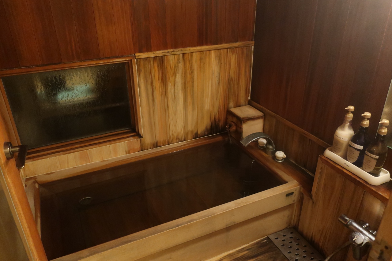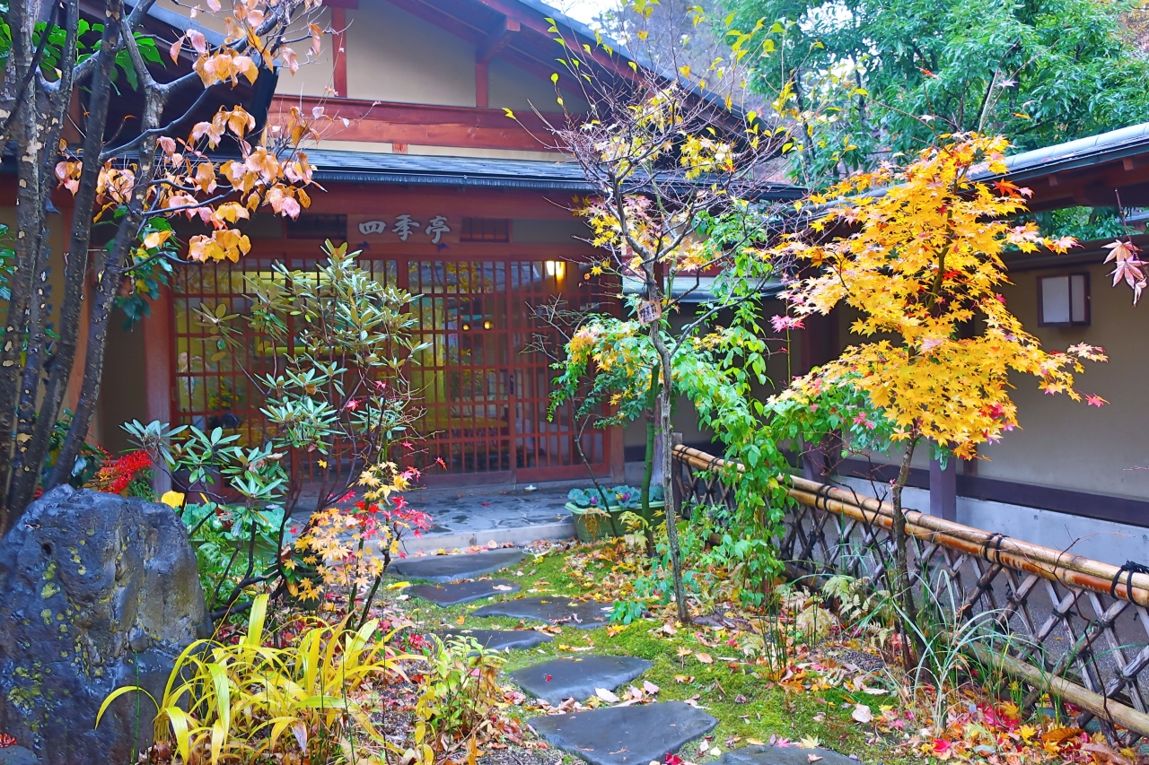 別所温泉の北向観音のすぐ隣にある旅館です。本館の柏和亭と離館の四季亭に15室の部屋があります。泊まった鳥月の間は四季亭の1階にある内風呂温泉付きの和洋室。少し白く濁った温泉はぬるめの設定なので長時間入れますが、ポカポカになります。また、肌にも良いと評判です。食事は本館2階の個室で懐石料理。朝は和洋食を選択できます。