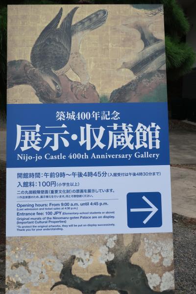 二条城を東大手門から入り北に行った休憩所の先に二条城 展示 収蔵館があります。入館するのに入場料と別に100円掛かりますが、是非見学して欲しい収蔵館です。と言うのも、二の丸御殿の障壁画のオリジナルが、再現された御殿とまったく同じ配置で展示されているからです。ガラス越しではありますが、間近で見られるの(御殿では見られません)必見です。